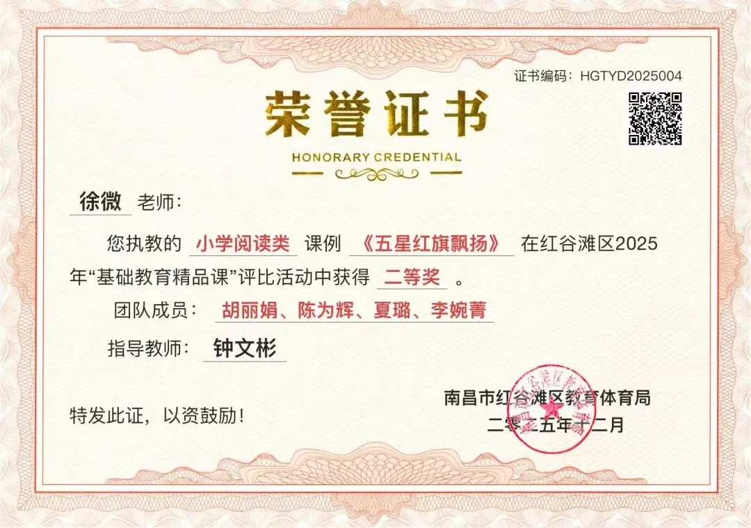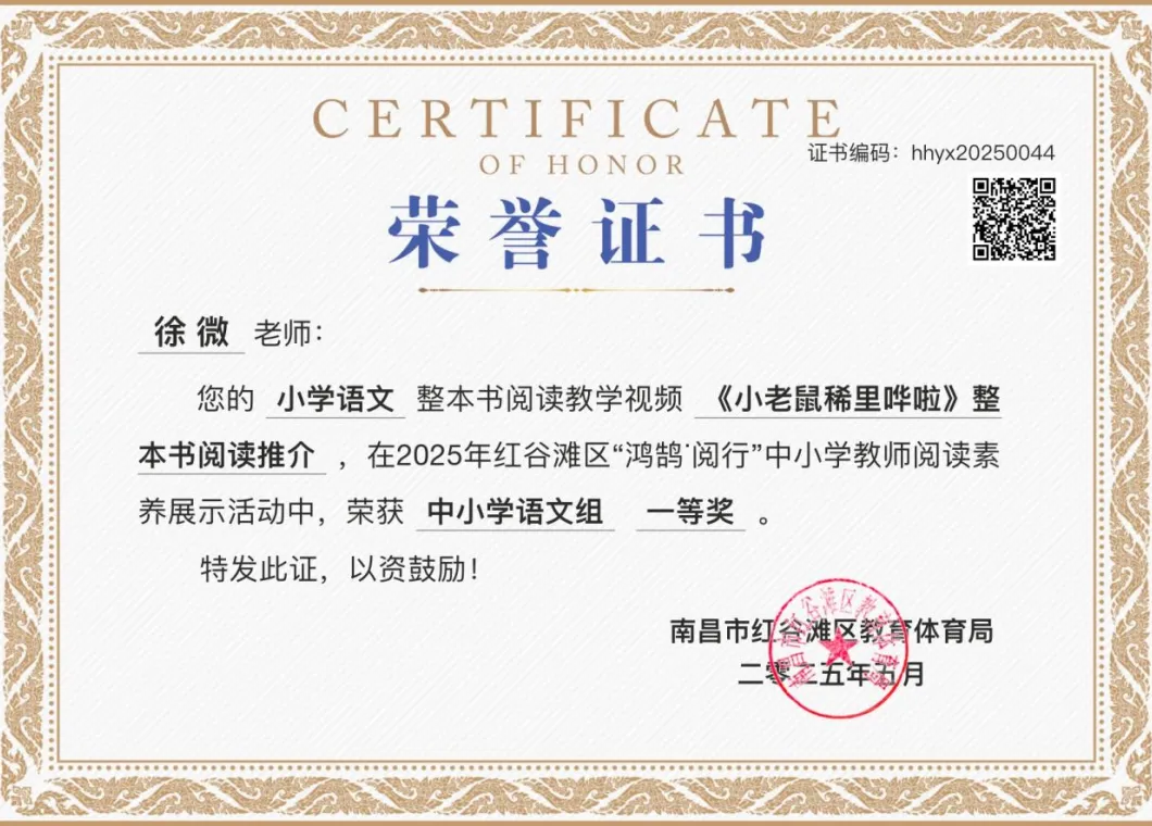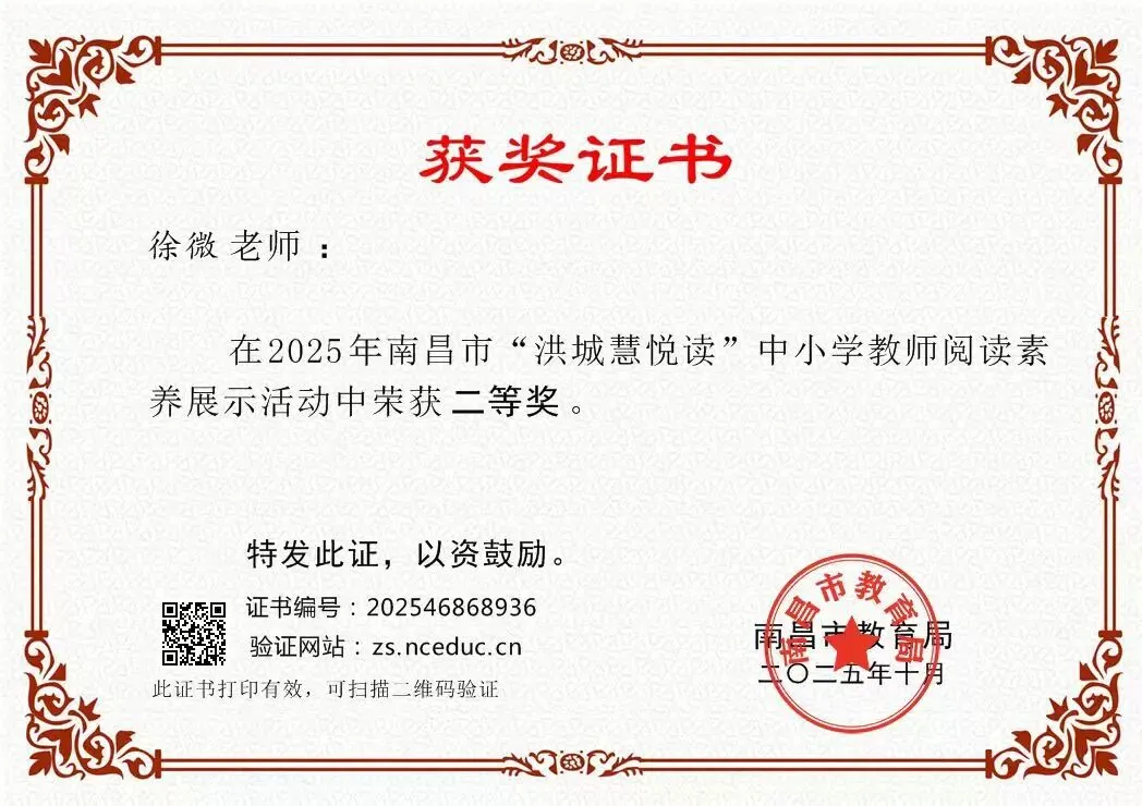 徐微荣获2025年红谷滩区“鸿鹄·阅行”中小学教师阅读素养比赛一等奖;