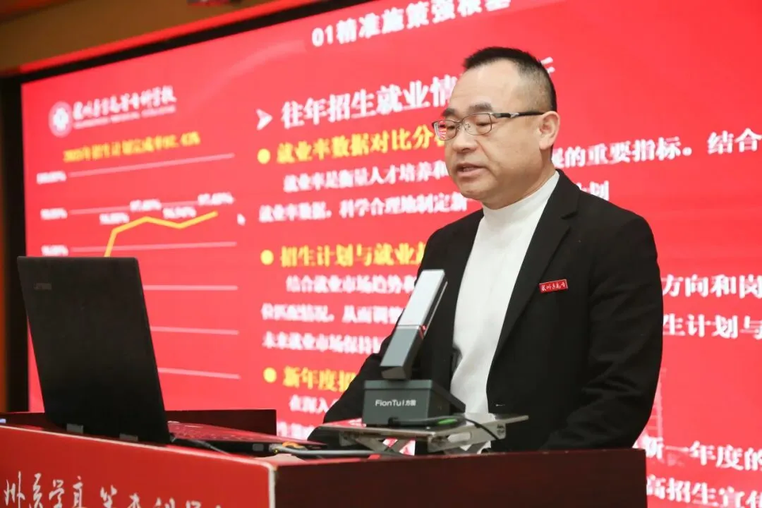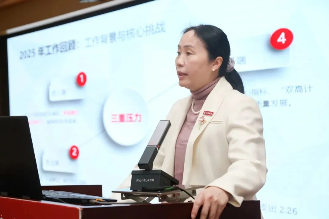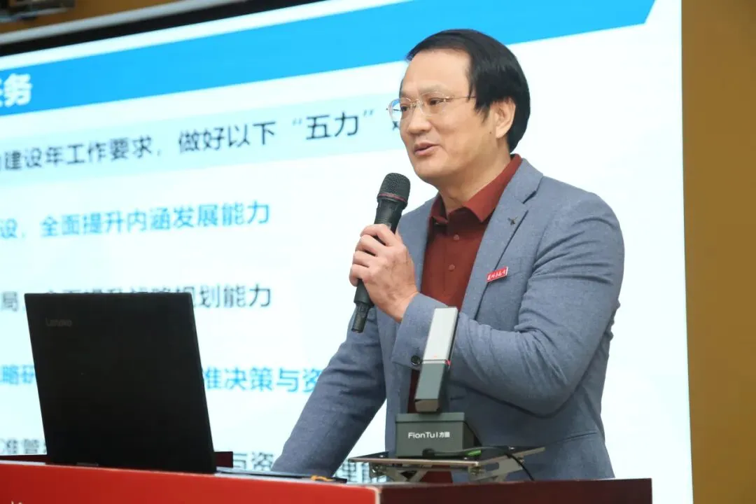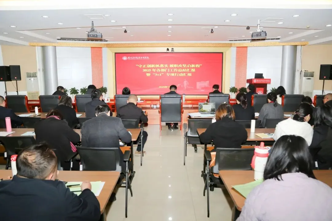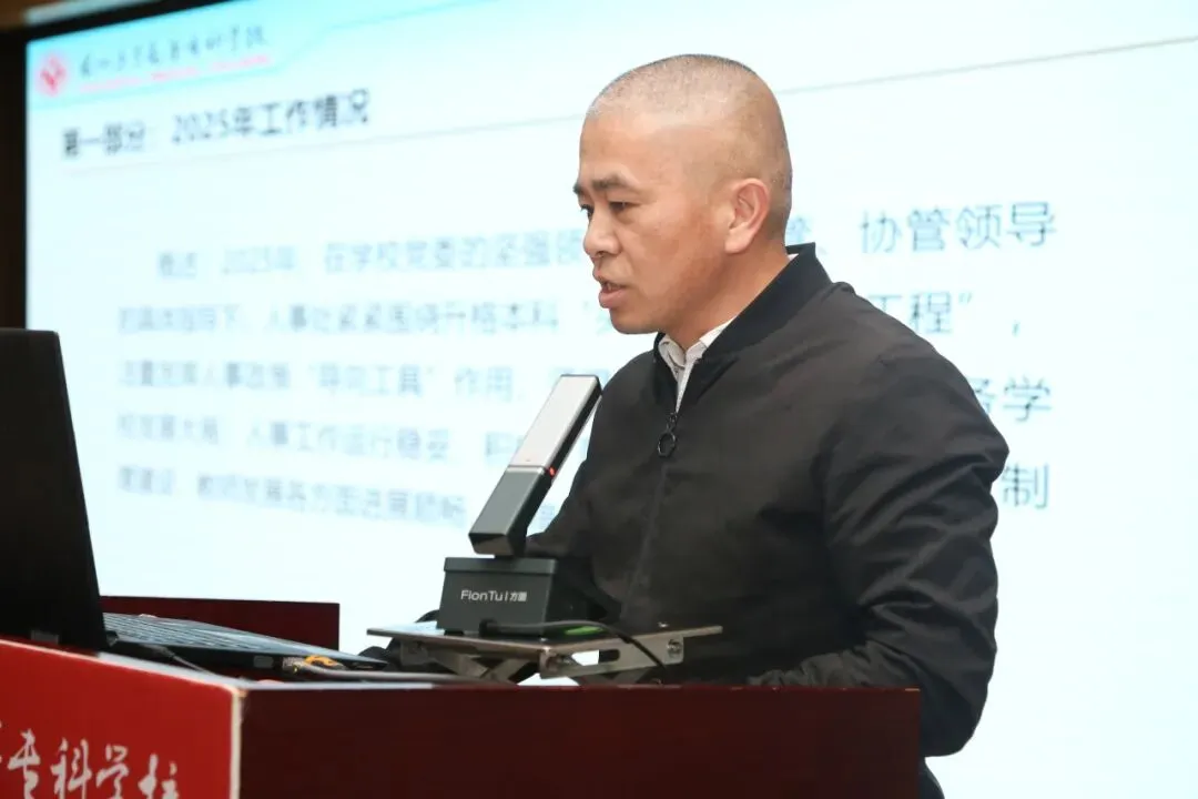 汇报结束后,校党委书记李伯群作点评讲话。李书记充分肯定了各部门2025年度的辛苦付出与取得的成绩,同时客观分析各部门的汇报亮点和存在的不足,并对2026年工作提出五点要求:一要深刻转变思想理念,紧扣学校内涵建设主线,全面对标本科办学标准,深化教学改革,完善人才培养体系,推动教学质量再上新台阶。二要夯实治理基础,筑牢长远发展根基,统筹推进制度体系建设与基础设施升级。三要强化效能导向,提升科学管理水平,加强绩效管理,全面推行项目化管理模式,优化资源配置,实现办学效益最大化。四要抓好发展基石,加强师资队伍建设,搭建校院两级培训平台,提升教师教学创新与实践能力。五要筑牢党建根基,守牢安全底线,以从严治党引领各项工作规范有序推进。