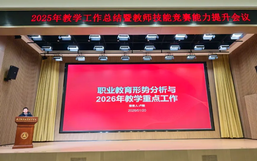 卢刚作职业教育形势分析及2026年教学工作布置,他科学分析了当前学校职业教育面临的六大发展趋势,布置了2026年教学八项重点工作。
