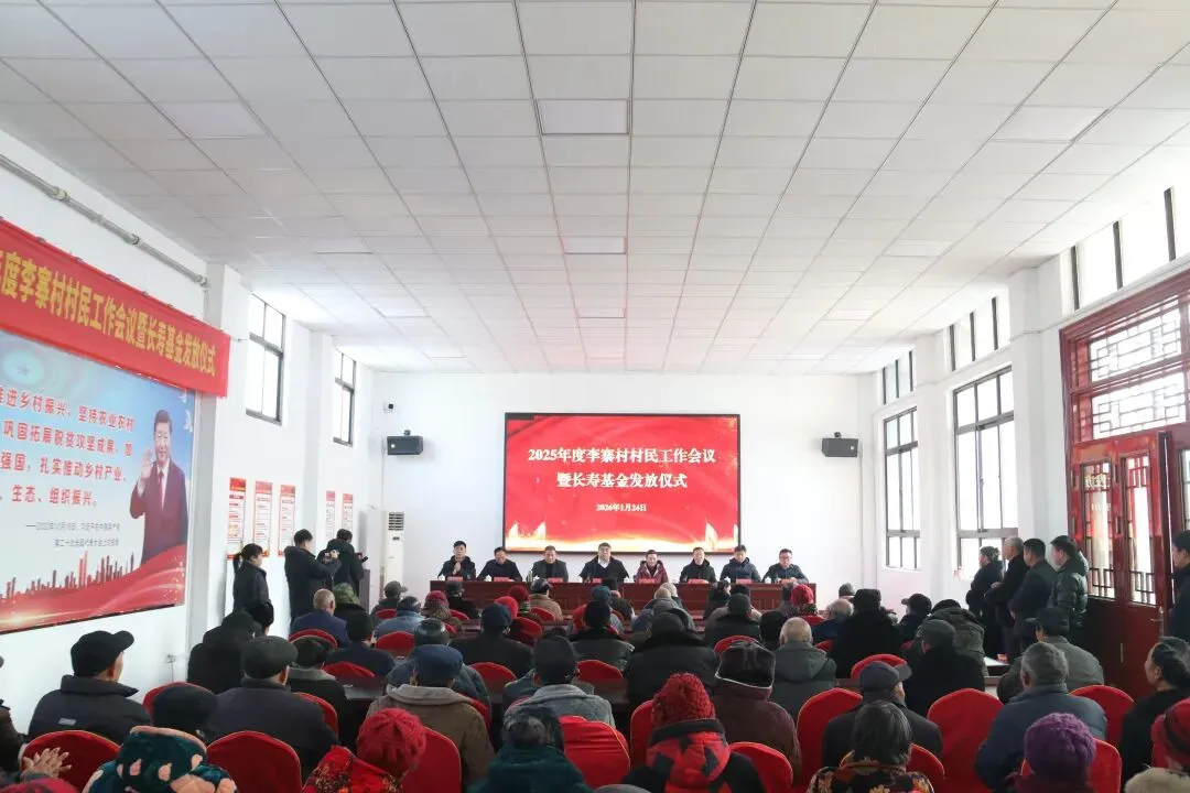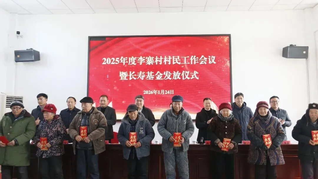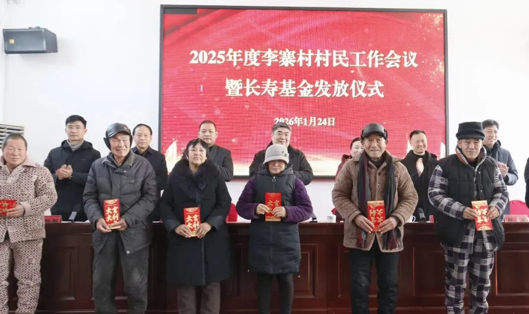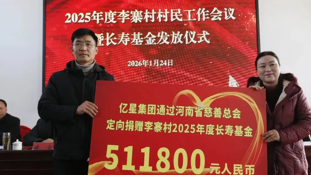 1月24日,李寨村举行2025年度工作总结会暨长寿基金发放仪式。会议主要总结李寨村2025年各项工作,部署2026年重点工作任务,下达李寨村2026年“十件实事”,并举行2025年度长寿基金发放仪式。沈丘县民政局党组书记、局长,县慈善会副会长、秘书长程成,冯营镇党委书记王巍,冯营镇人大主席赵地,沈丘县人社局驻村第一书记臧宝,亿星集团常务副总裁赵广良,黄淮股份总经理姚福敬,集团总裁助理吕凤生,周口电视台中心城区融媒体中心主任王磊,李寨村党支部副书记李鹏辉等出席会议。会议由赵地主持。李寨村“两委”干部、群众代表、亿星集团驻村帮扶人员及新闻媒体共同见证李寨村的发展荣光与暖心时刻。