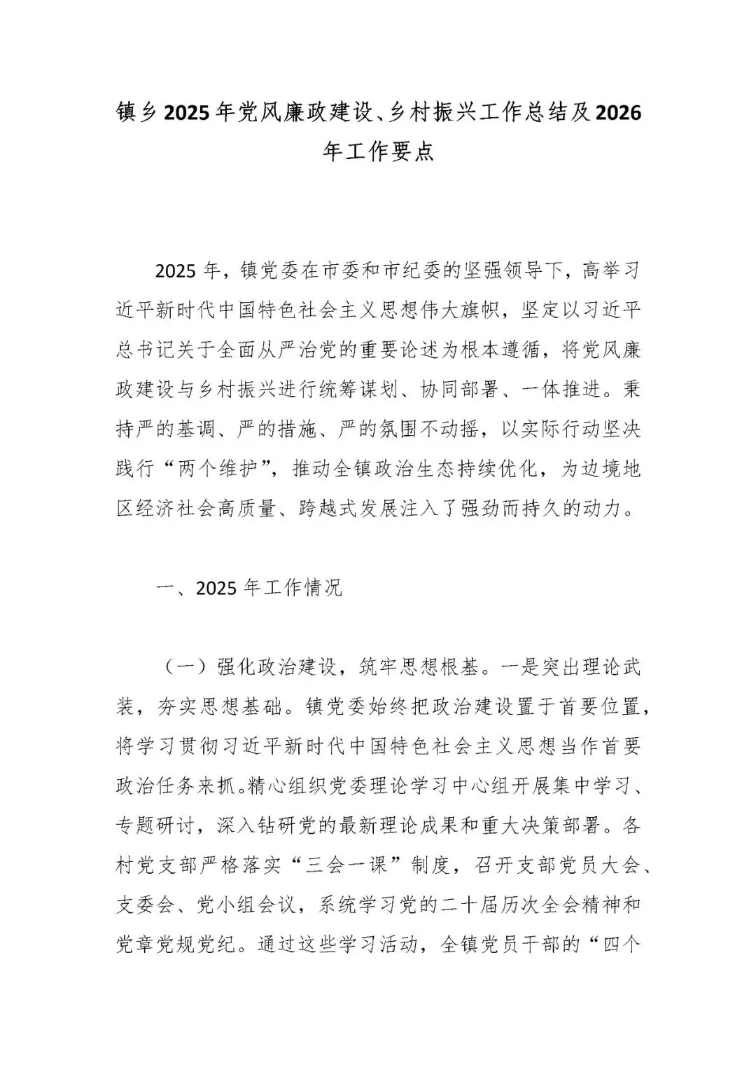 镇乡2025年党风廉政建设、乡村振兴工作总结及2026年工作要点