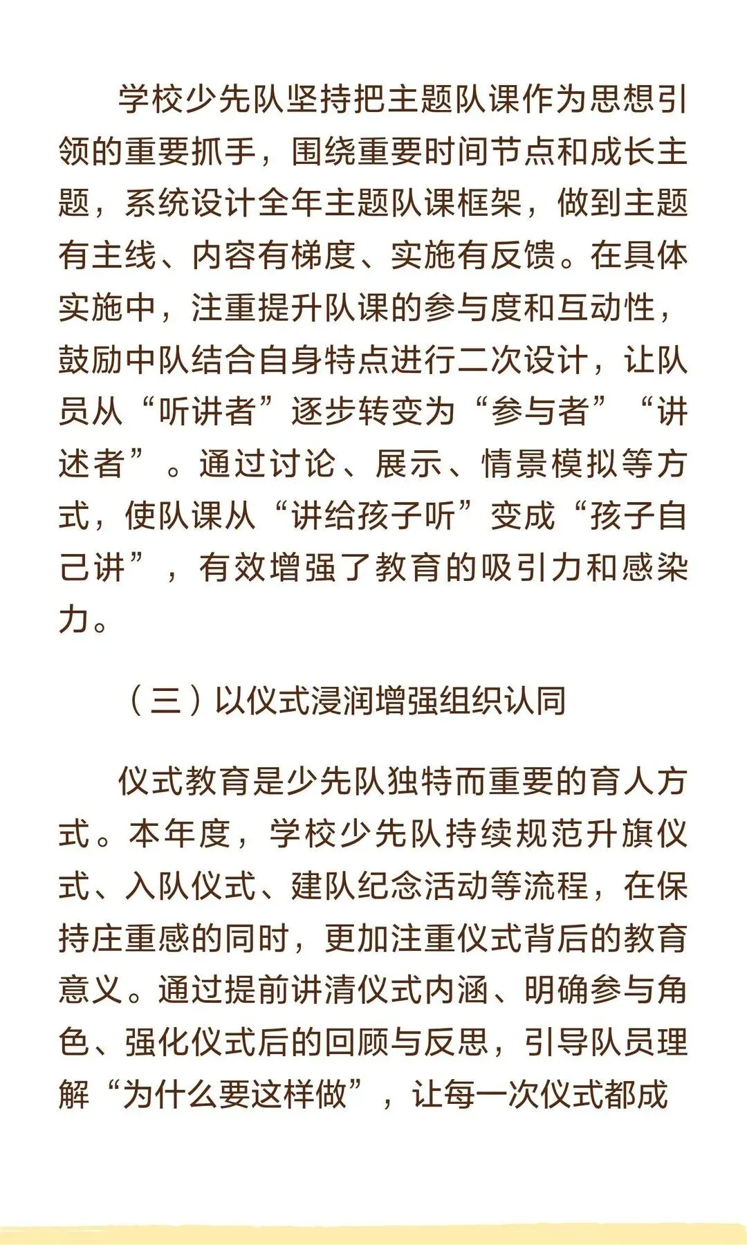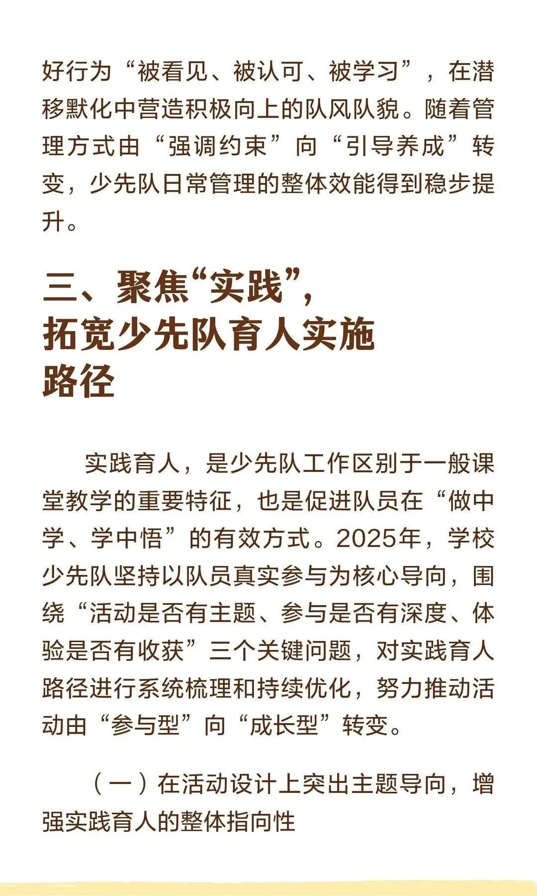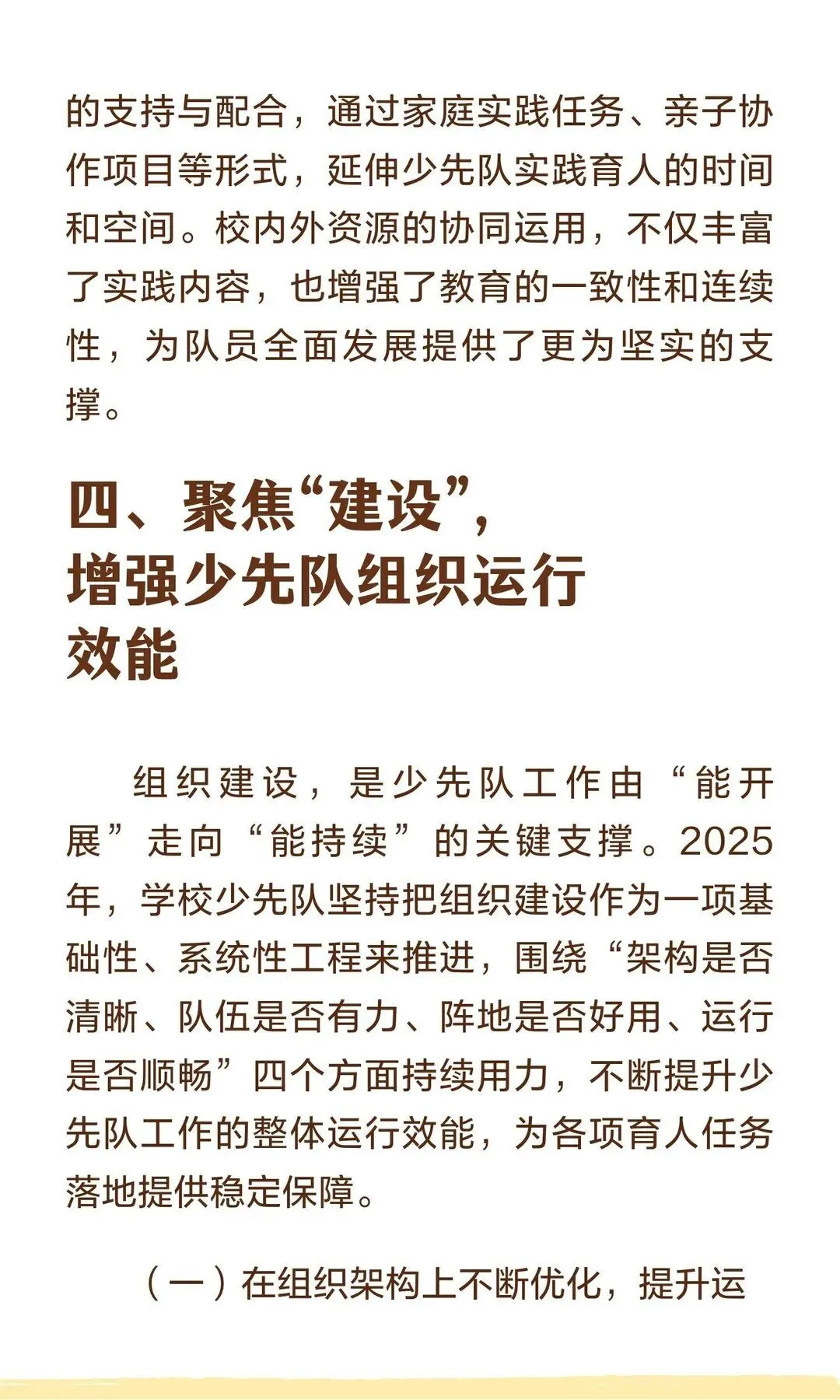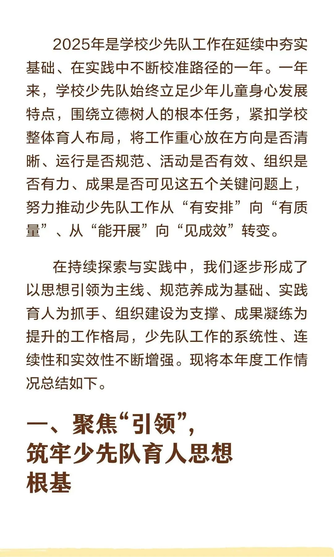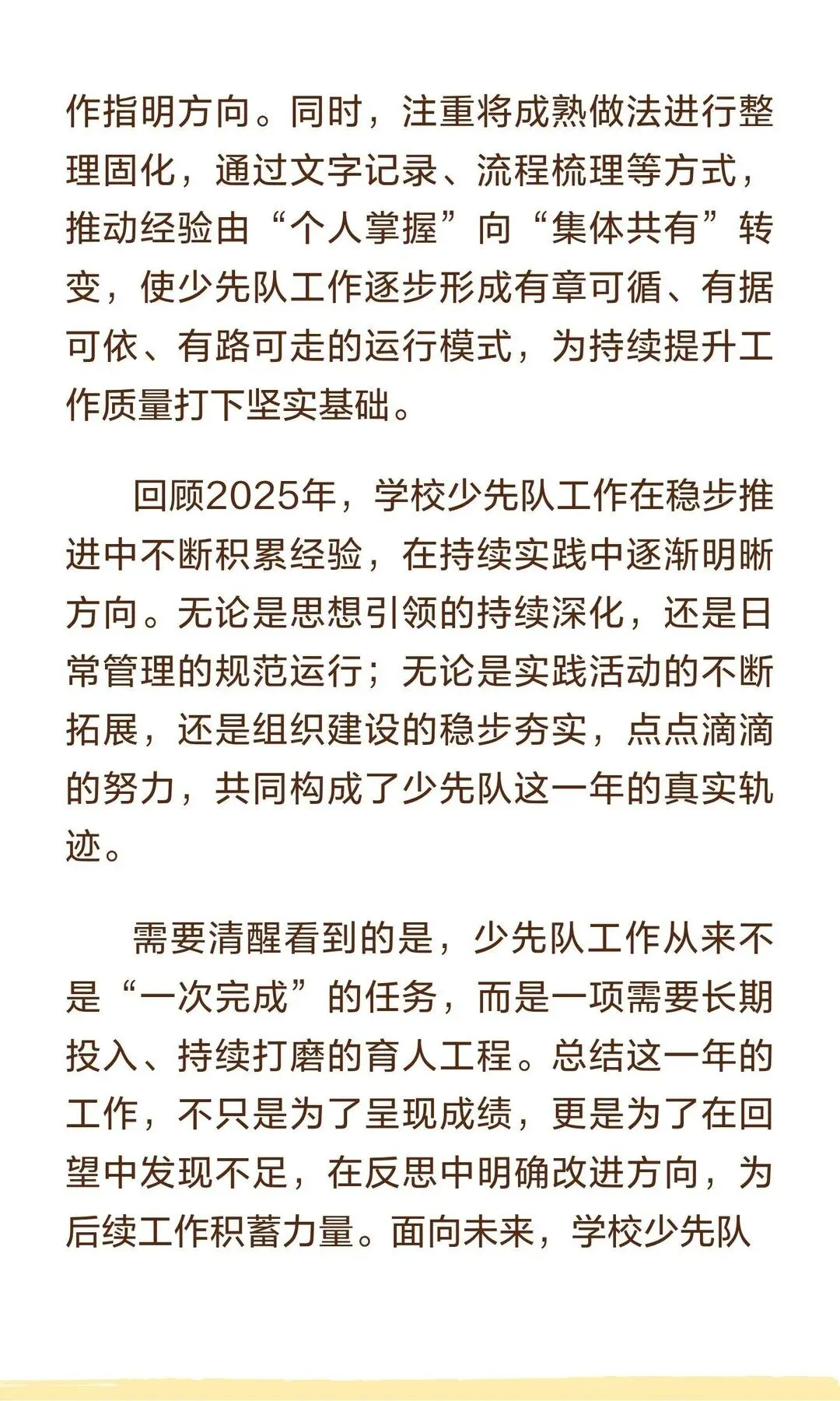2025年,学校少先队工作聚焦思想引领、规范管理、实践育人和组织建设,推动工作从“有安排”向“有质量”转变,形成系统化格局,增强组织效能,提升队员成长,为未来持续优化奠定基础。