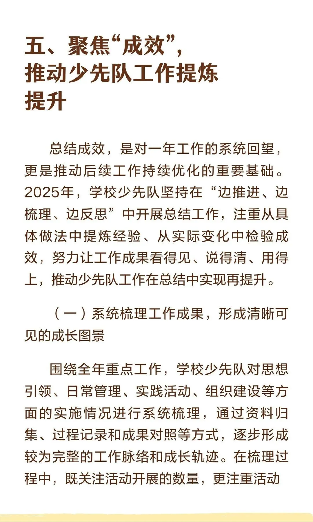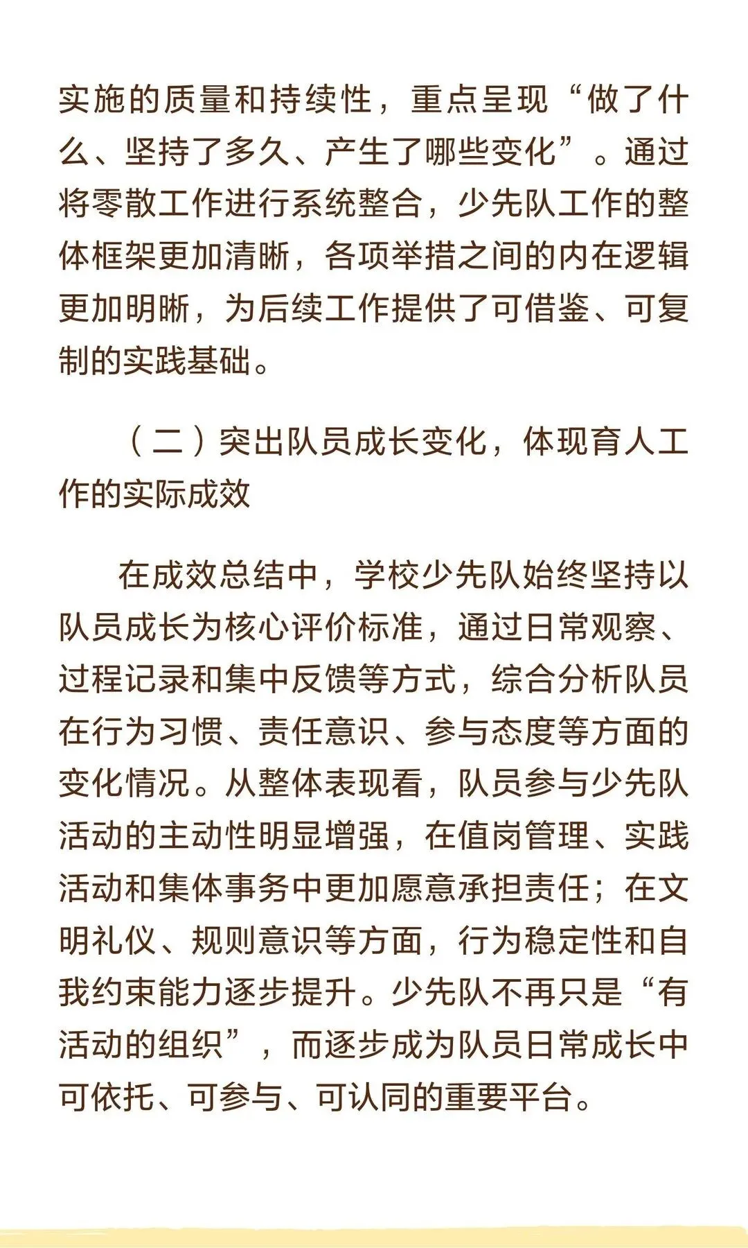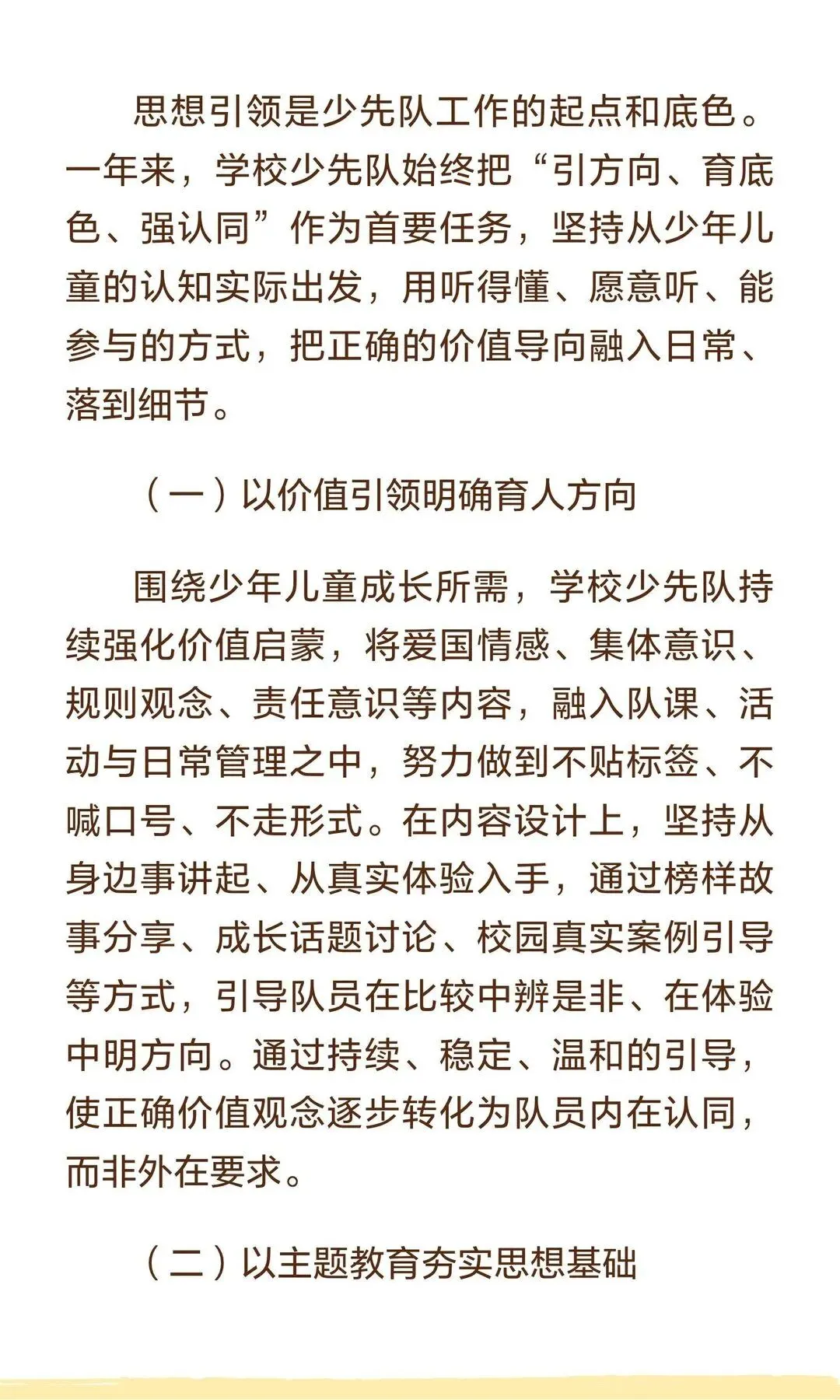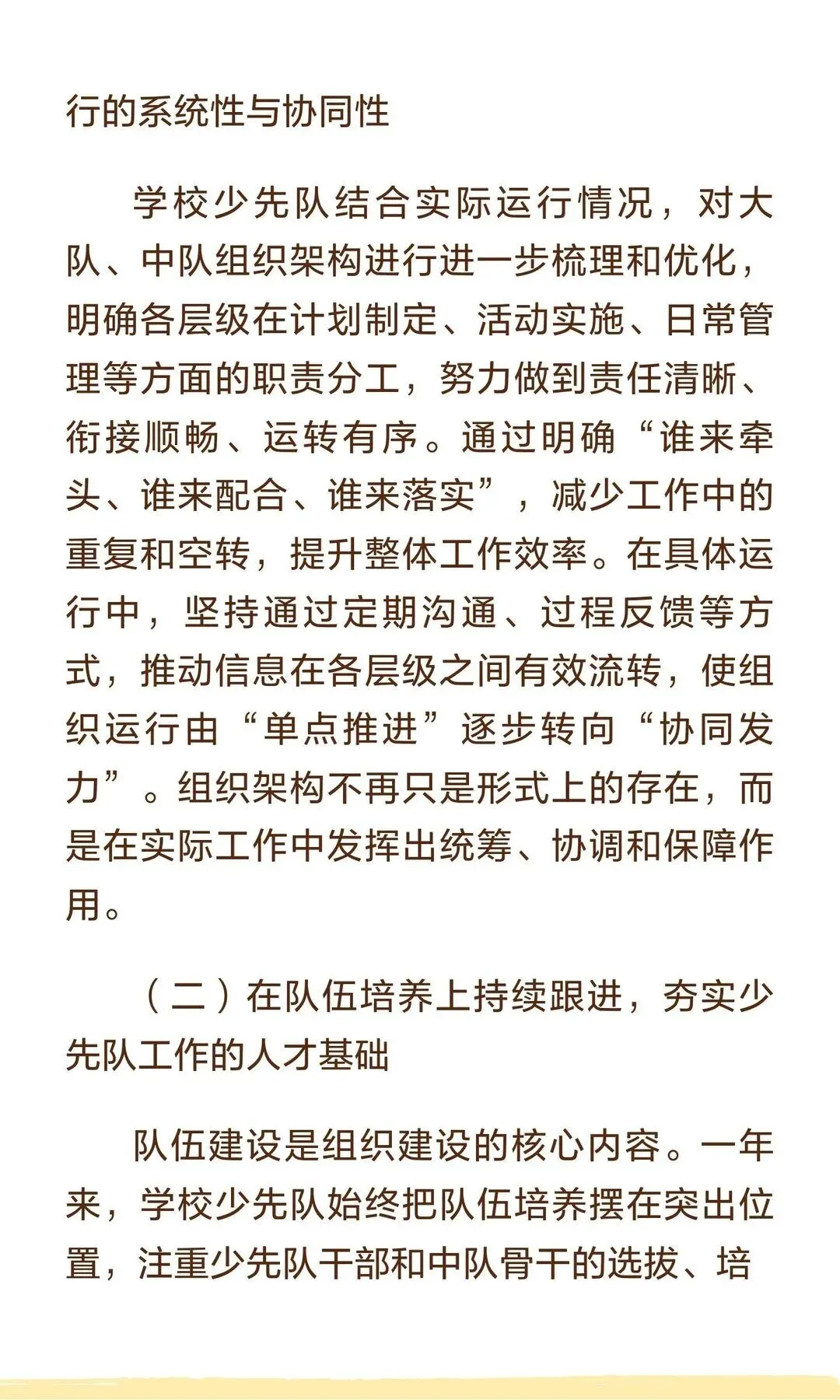 2025年,学校少先队工作聚焦思想引领、规范管理、实践育人和组织建设,推动工作从“有安排”向“有质量”转变,形成系统化格局,增强组织效能,提升队员成长,为未来持续优化奠定基础。