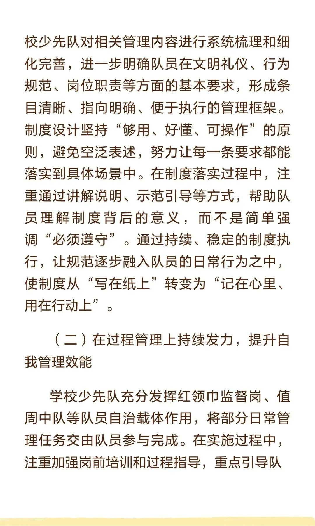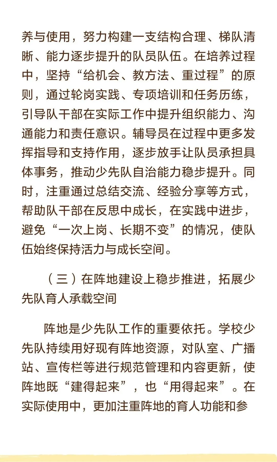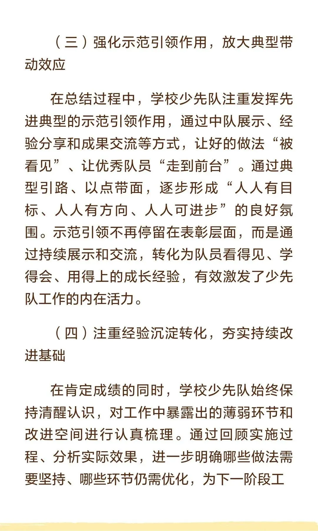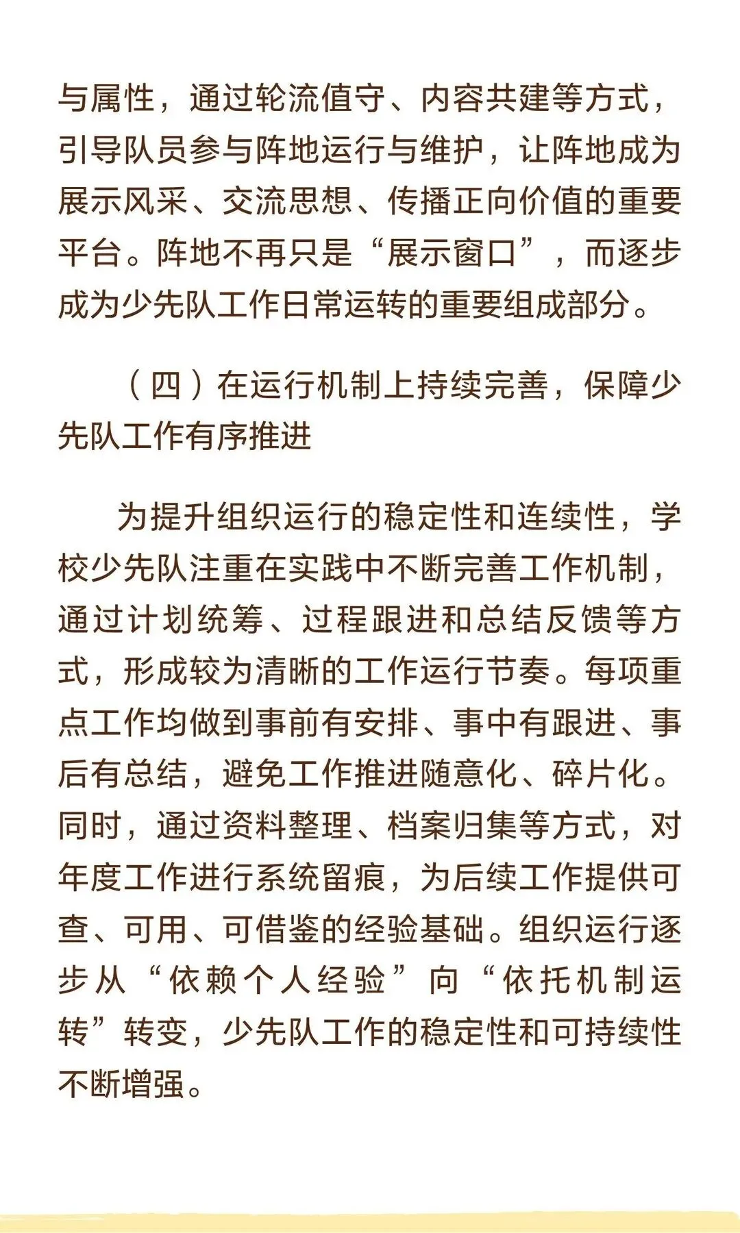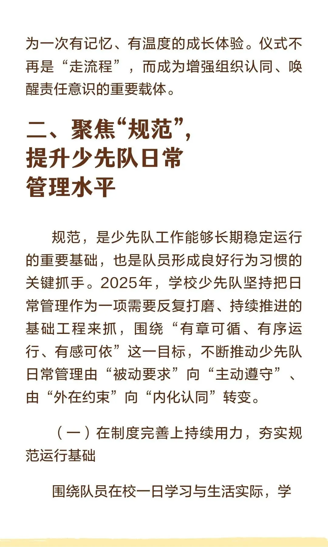 2025年,学校少先队工作聚焦思想引领、规范管理、实践育人和组织建设,推动工作从“有安排”向“有质量”转变,形成系统化格局,增强组织效能,提升队员成长,为未来持续优化奠定基础。