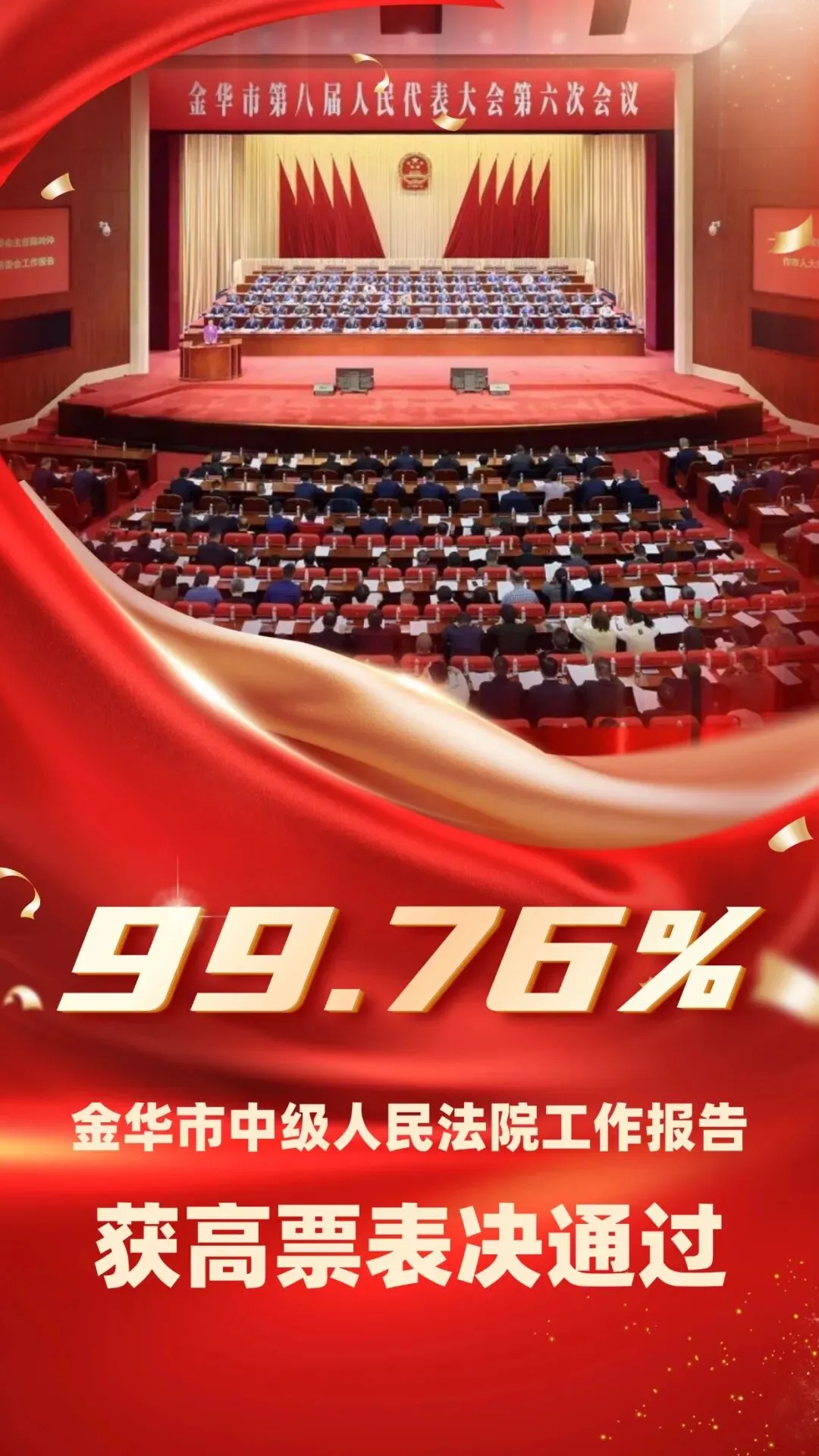 1月24日,经金华市第八届人民代表大会第六次会议表决,金华市中级人民法院工作报告以99.76%的赞成率获高票通过。
