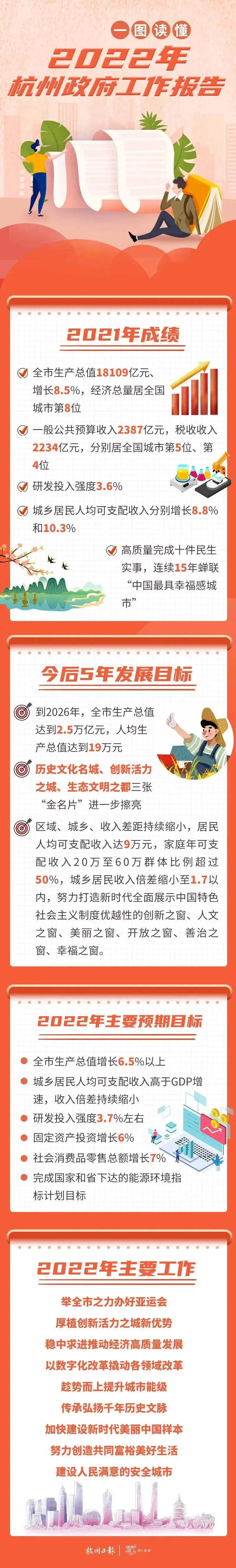 3月26日上午,杭州市第十四届人民代表大会第一次会议在省人民大会堂开幕。过去一年杭州经济社会发展成绩如何?今后5年发展蓝图如何勾画?今年政府工作有啥新目标新任务?一图读懂极简版2022年政府工作报告!