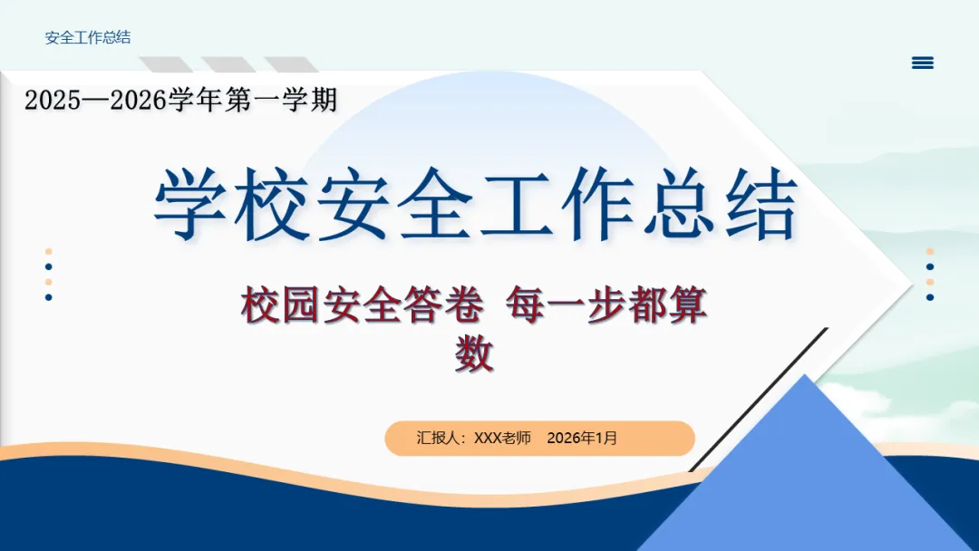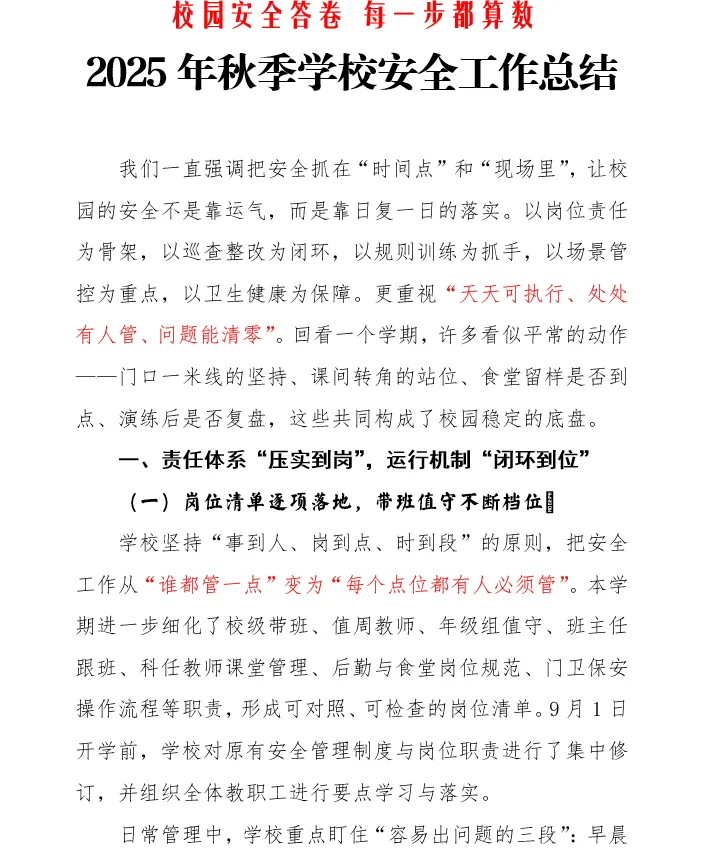 2025 年秋季学期,学校始终将安全工作扎根 “时间点” 与 “现场里”,以责任为骨、流程为纲、细节为要,筑牢校园安全防线。现将本学期安全工作核心总结如下: