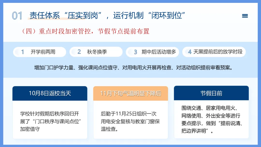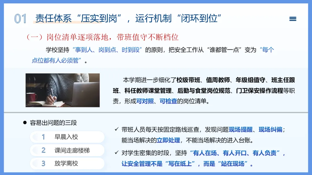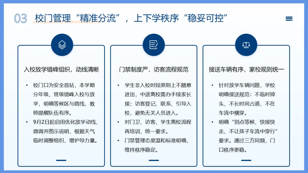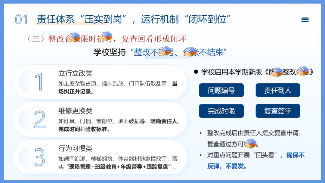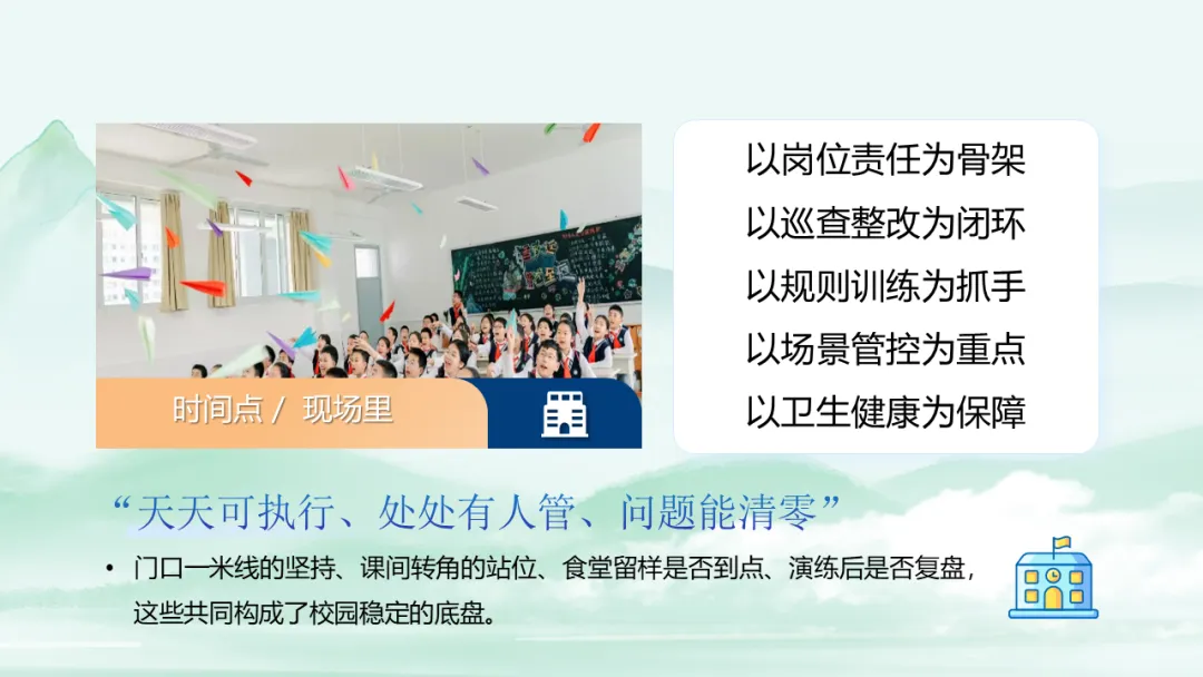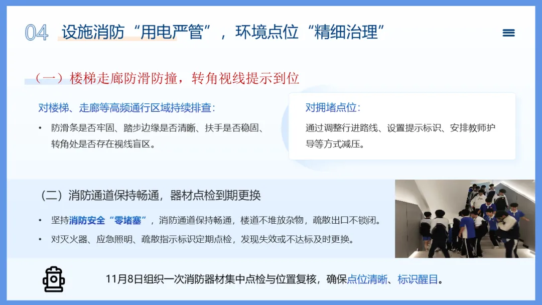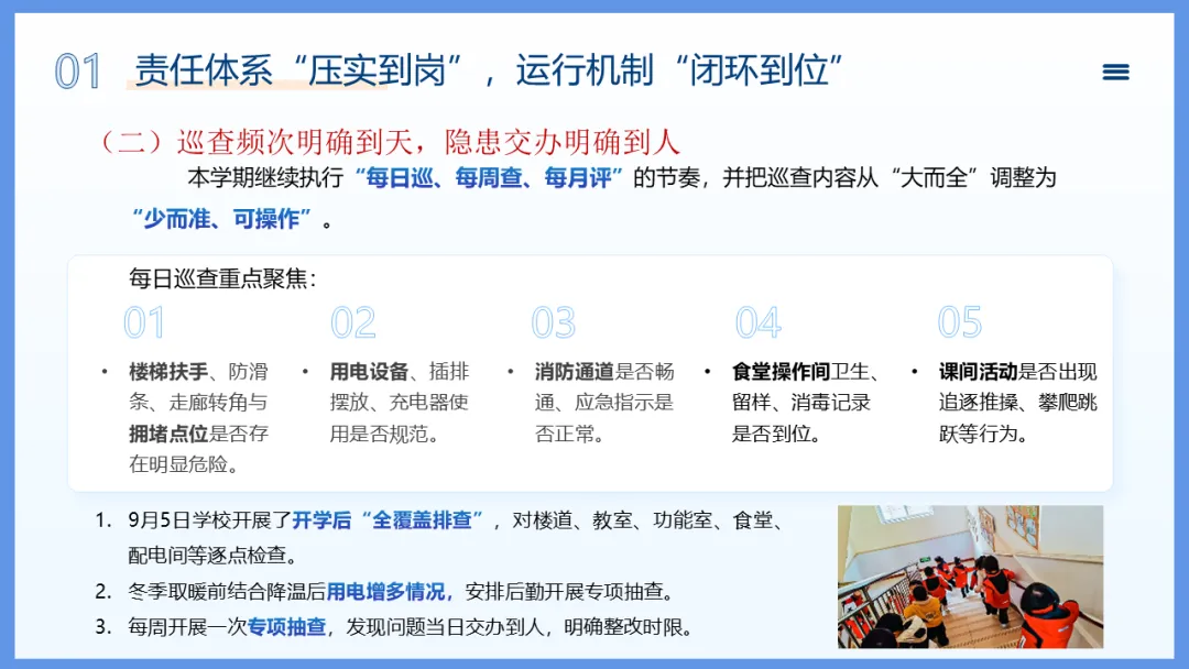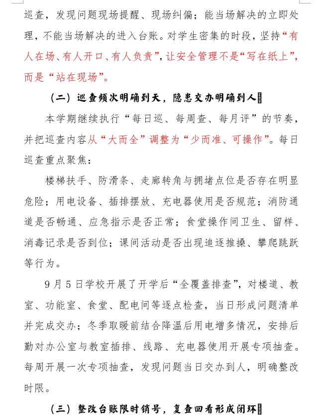学校坚守 “事到人、岗到点、时到段” 原则,细化校级带班、教师值守、后勤保障等全岗位安全清单,开学前完成制度修订与全员培训。聚焦早入校、课间、放学 “关键三段”,实行 “每日巡、每周查、每月评” 机制,重点排查楼梯防滑、用电规范、消防通道、食堂卫生等核心点位。建立 “问题编号 — 责任到人 — 限时整改 — 复查销号” 闭环台账,对杂物占道等立行立改,对设施破损等明确维修时限,对行为习惯问题强化跟踪督导,确保隐患清零不反弹。关键节点加密管控,开学季、秋冬换季、节假日前后提前部署,筑牢安全屏障。
