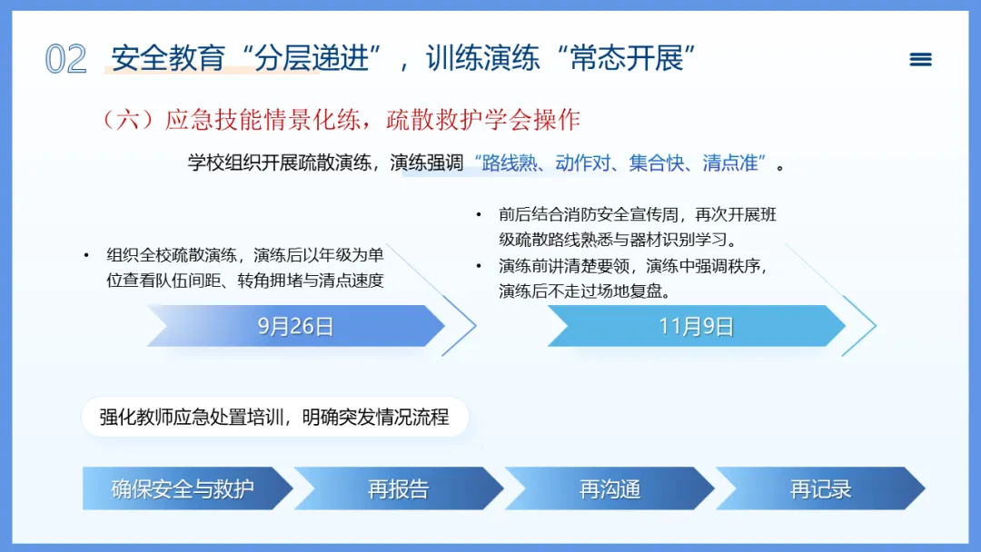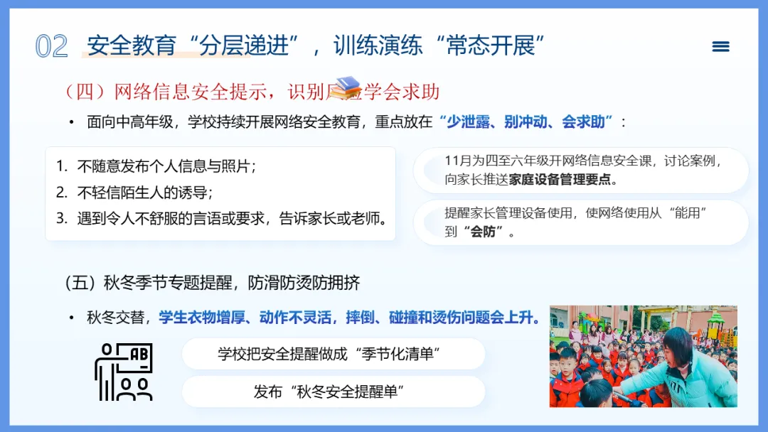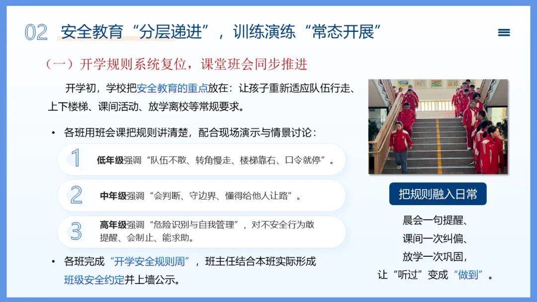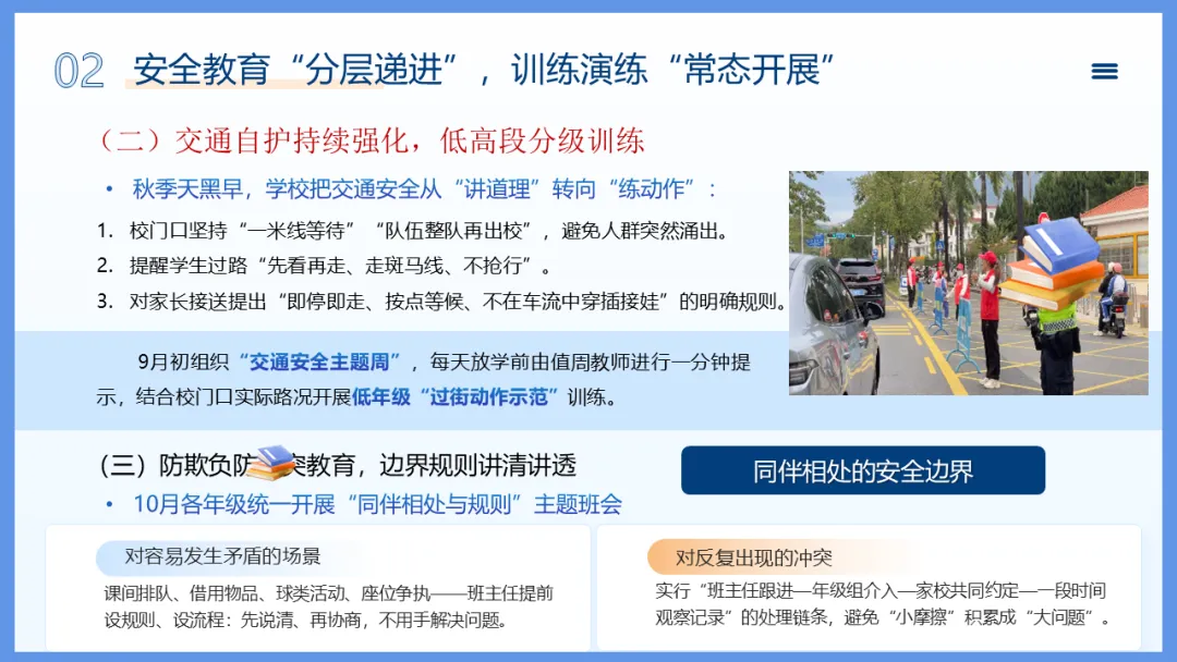 开学初开展 “安全规则周”,分学段明确行为规范,低年级重 “守秩序”,中年级重 “懂边界”,高年级重 “会自护”,通过班会演示、情景讨论筑牢基础。针对秋季特点强化交通安全,推行 “一米线等候”“即停即走” 等规则,低年级开展过街示范训练,高年级讲解风险判断技巧。聚焦防欺负、网络安全等重点,通过主题班会解析案例,教学生 “会表达、懂求助”。结合秋冬季节特性,发布防滑防烫防拥挤提示,常态化开展疏散演练与教师应急救护培训,确保技能落地。