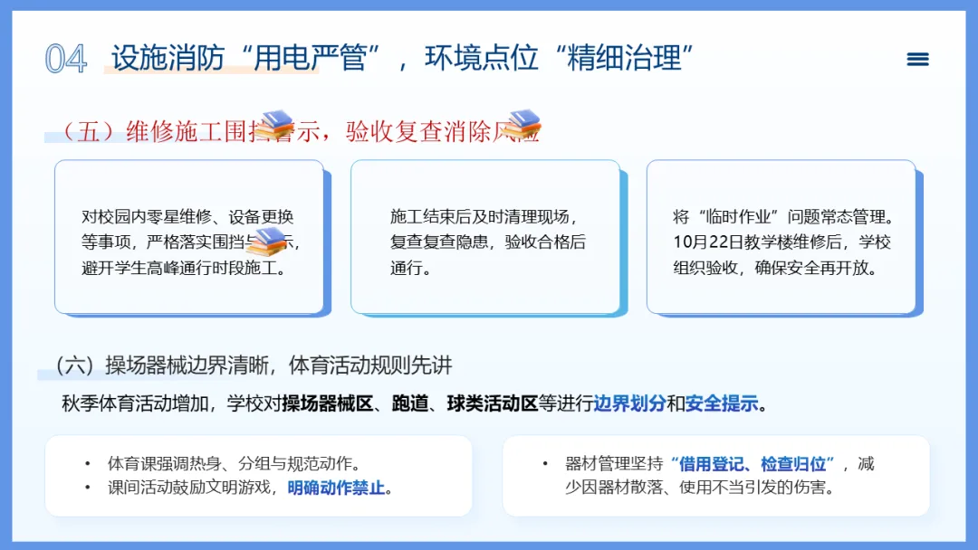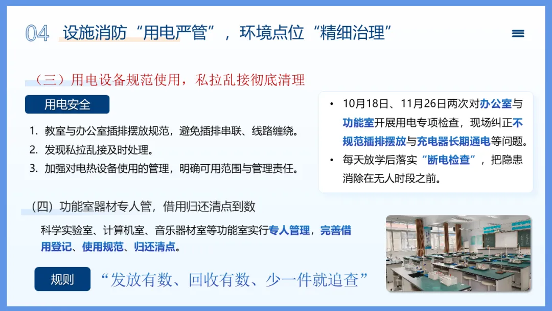 设施管理聚焦细节,排查楼梯扶手、防滑条等通行安全,确保消防通道畅通、器材完好;规范用电设备使用,清理私拉乱接现象;功能室器材专人管理、借还登记;维修施工设置围挡警示,验收合格再开放;划分操场活动区域,明确体育活动规则。