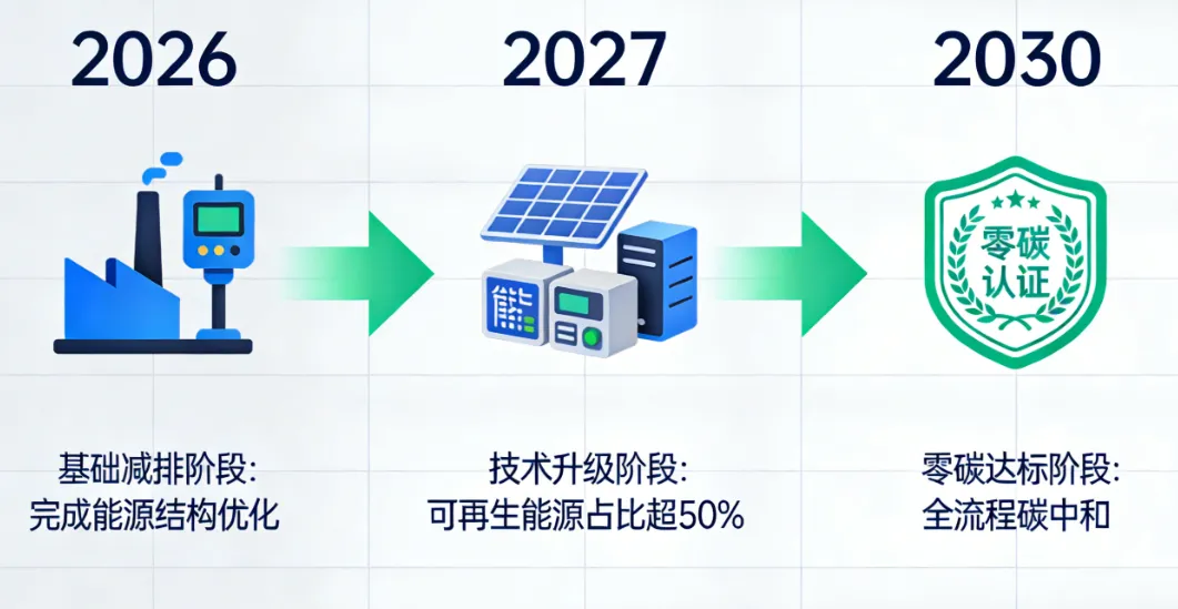 分阶段推进脱碳:优先开展自主减排(如能效提升、电气化改造),结合自身行业特点布局绿电绿证交易,待跨境碳交易规则明确后再规划抵销方案。