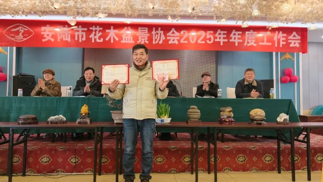 最后,寇爱明会长作总结讲话,他分享了2026年工作思路。他表示,2025年的成绩离不开全体会员的同心协力与主管单位的悉心指导,新的一年,协会将继续立足安陆“有自然资源、有文化底蕴、有人才梯队”的特色优势,深化“三自”活动模式,持续提升会员技艺水平。重点围绕市委市政府市政建设部署,推动盆景艺术走进社区、走进学校、贴近市民,计划今年在太白广场举办银杏盆景、奇石根艺展,探索盆景艺术与城市景观融合的有效路径,同时助力会员打造具有本地特色的私家盆景园与小型博物馆,让安陆盆景艺术在传承中创新、在交流中发展。