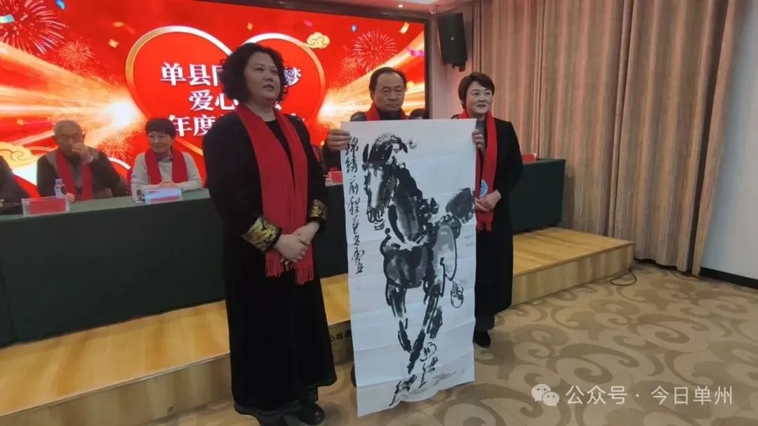 为表彰先进、树立榜样,会议对2025年度先进个人、先模人物进行表彰,为郭丽、刘倩等20名优秀志愿者颁发荣誉证书;为山东朱氏药业集团、四君子集团、莱河酒业等爱心企业及商家授牌,感谢其长期以来的公益支持;举行爱心工作部部长及服务站站长授聘仪式,朱明霞、许建平、王献云、邹辉等同志受聘上岗。6位爱心书画家现场捐赠书画作品,以笔墨传情,助力公益事业。