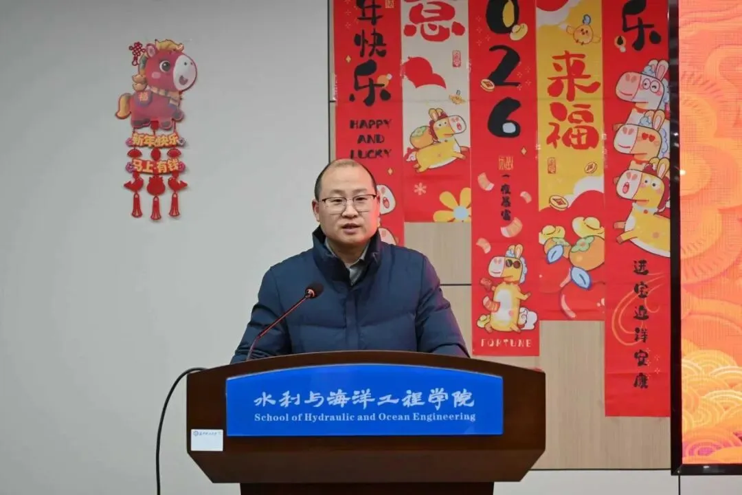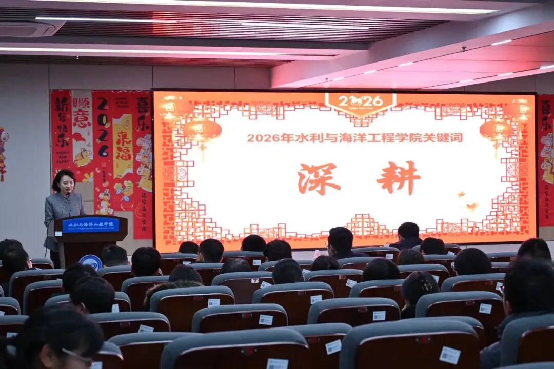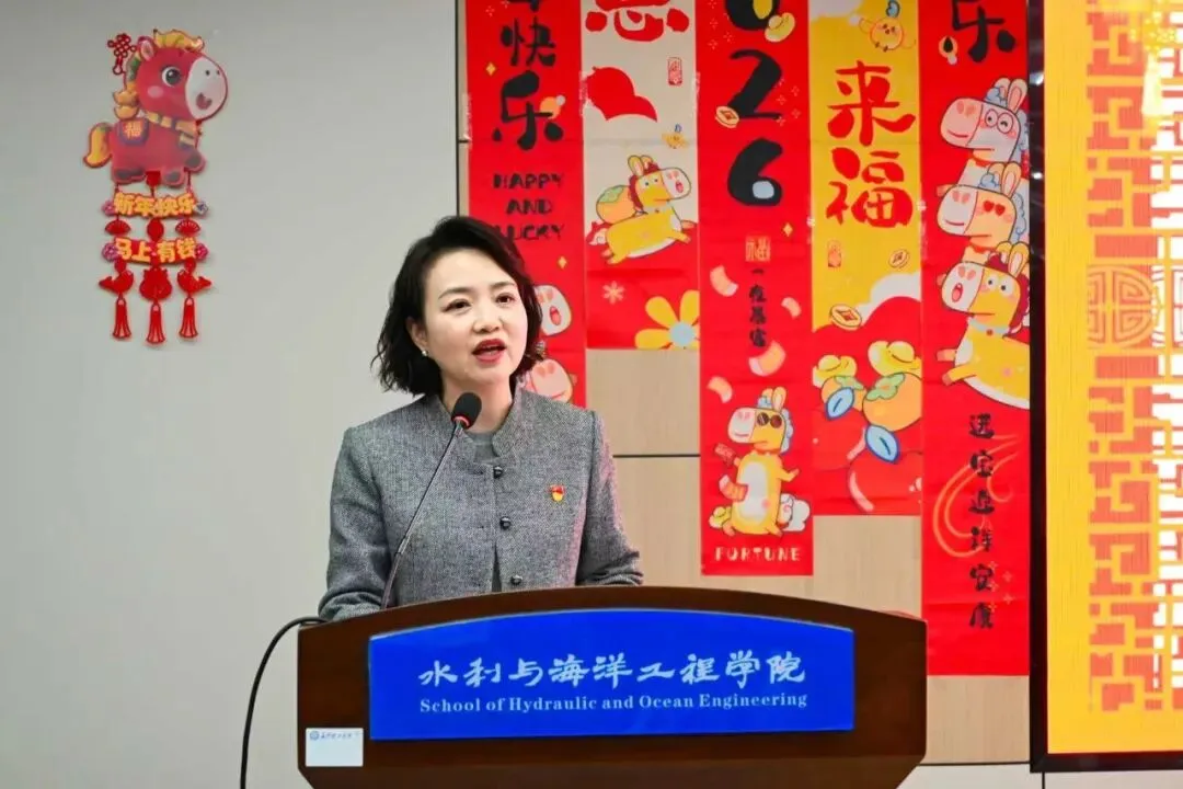 大会最后,喻玲娜发表新年致辞。她以“深耕”二字作为学院2026年关键词,高度肯定了全院师生在学科攀登、育人提质、社会担当等方面的拼搏精神与丰硕成果。在新的一年,恰逢学校70周年校庆,喻玲娜号召全体水利人秉承大禹精神,胸怀海洋格局,以“功成不必在我”的境界和“功成必定有我”的担当,持续深耕,精益求精,共同谱写水利与海洋工程学院更加辉煌灿烂的明天。大会在热烈掌声和对新年的美好祝福中圆满落幕。