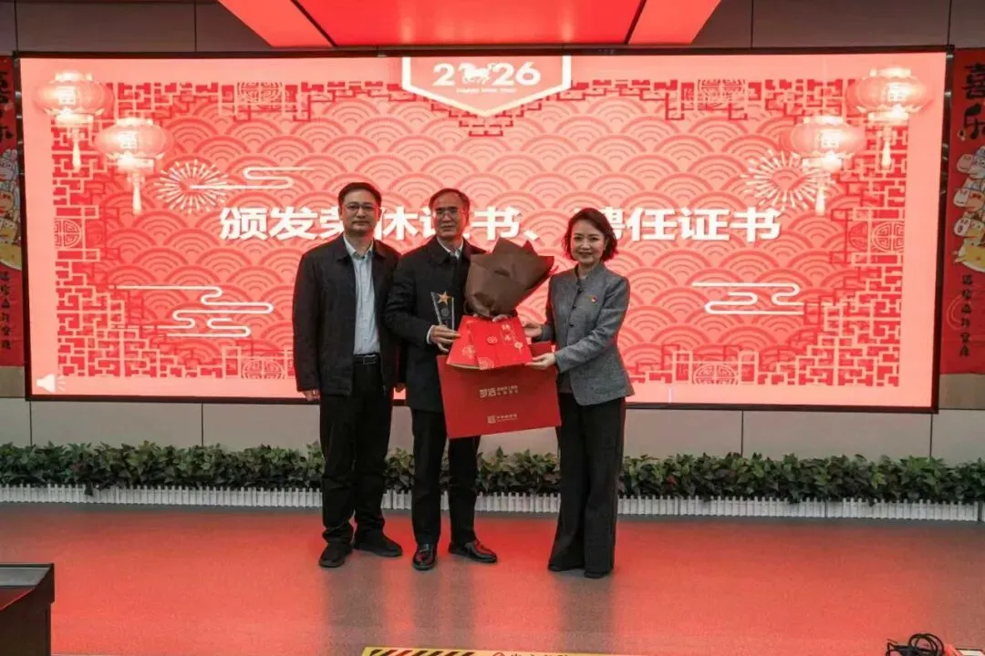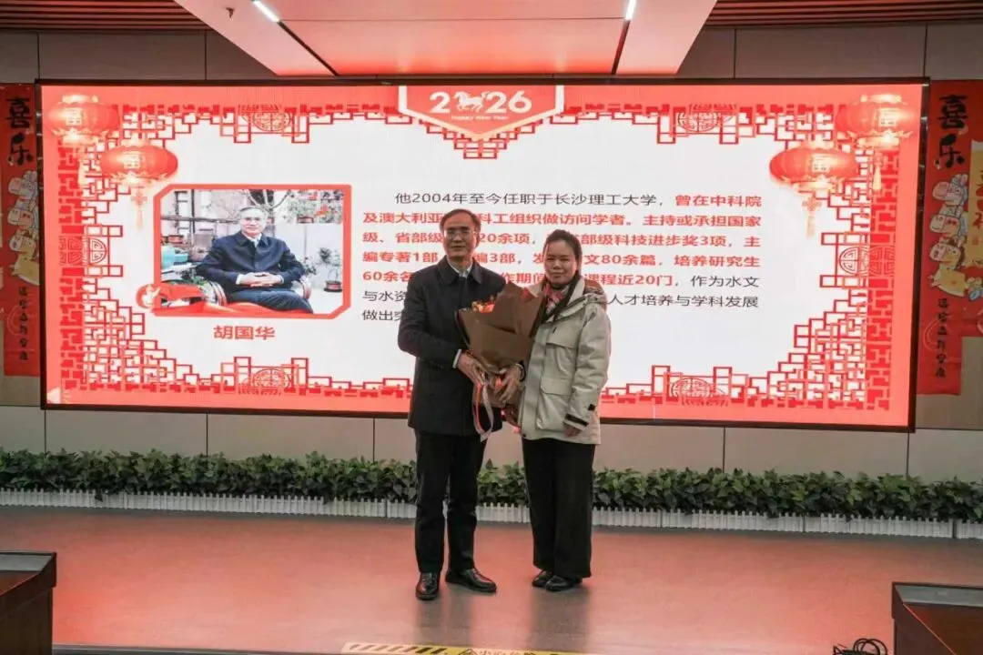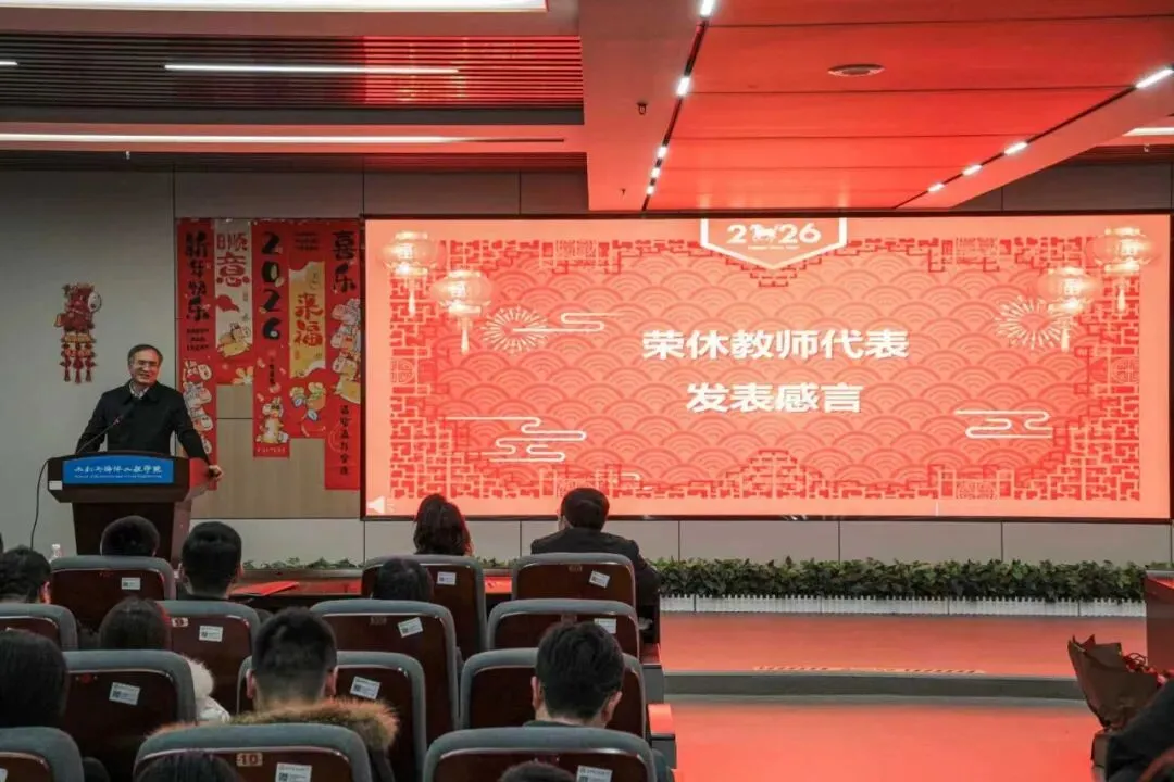 大会特别为2025年度光荣退休的苏忖安、王祖志、陆浩、胡国华四位老师举行了温馨而庄重的荣休仪式。荣休教师代表胡国华上台接受鲜花、荣休证书、纪念水晶杯及学院创新人才培养计划特聘导师证书。胡国华老师发表了深情寄语,分享了数十载执教生涯的感悟,其坚守与情怀令在场教师动容。