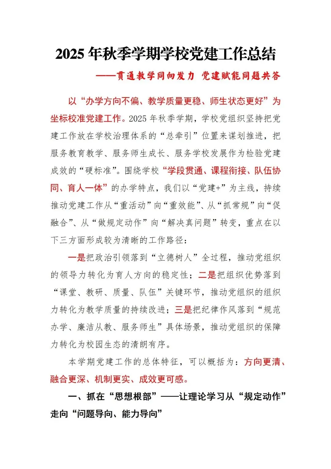 >2025年秋季第一学期学校党建工作总结:贯通教学同向发力,党建赋能同题共答(word版)