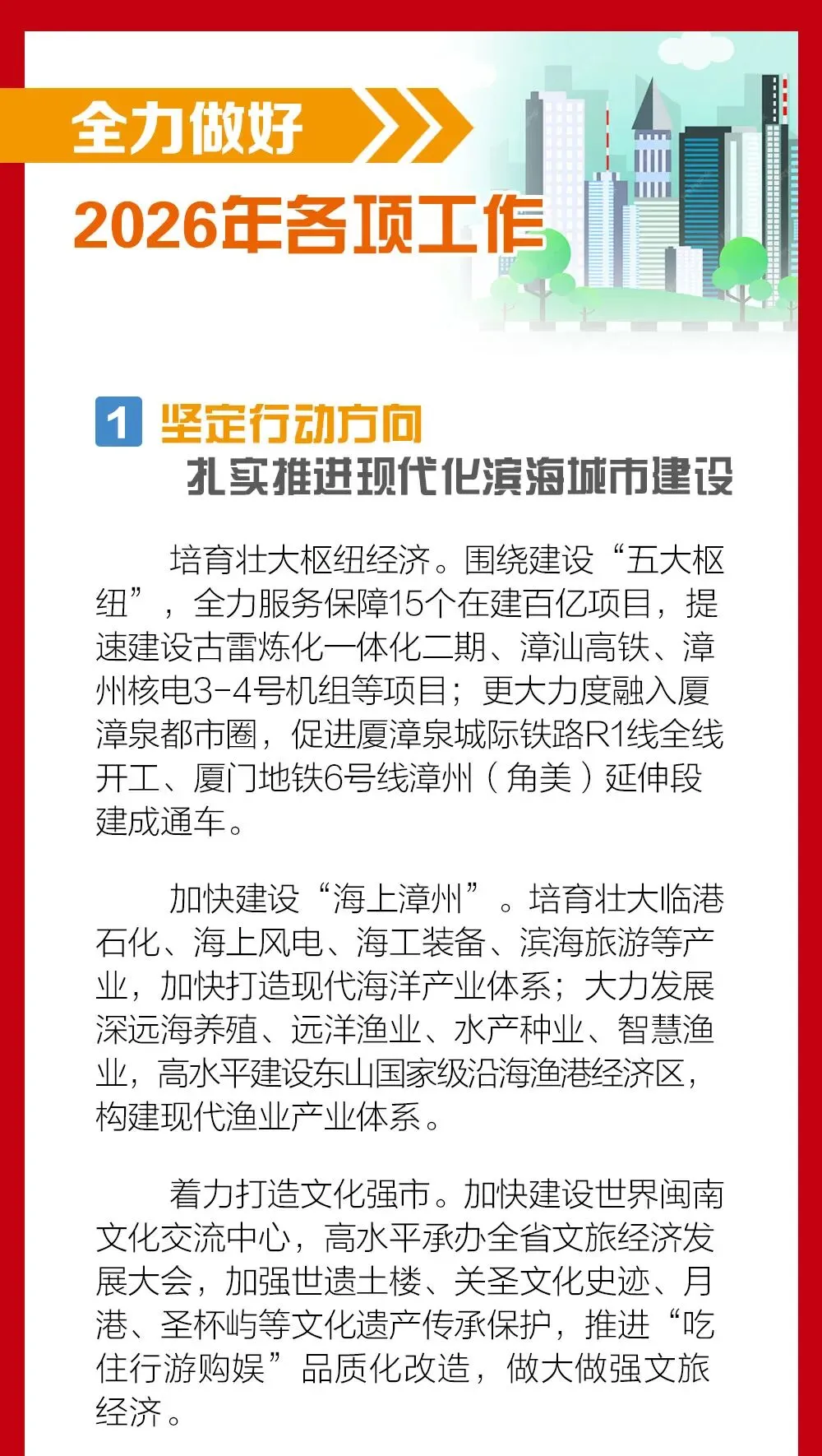1月22日上午,漳州市第十七届人民代表大会第六次会议在漳州宾馆文体中心开幕。市长魏东代表市政府向大会作工作报告。报告分为四部分:一是“十四五”时期和2025年工作回顾;二是实施“十五五”规划,奋力谱写中国式现代化漳州篇章;三是全力做好2026年各项工作;四是树立和践行正确政绩观,努力建设让人民满意的政府。