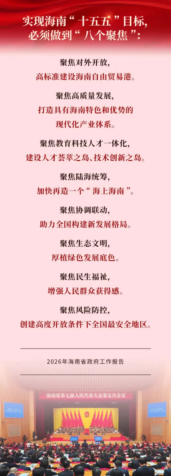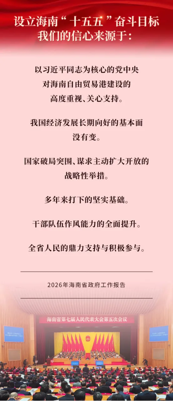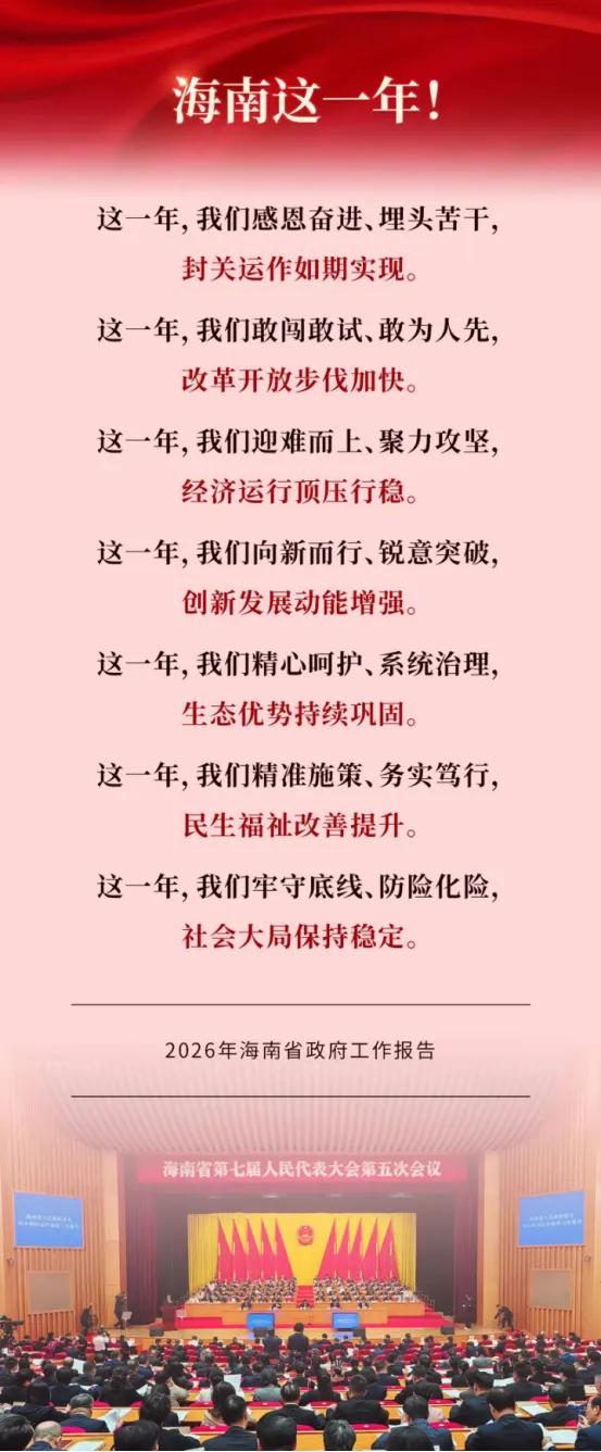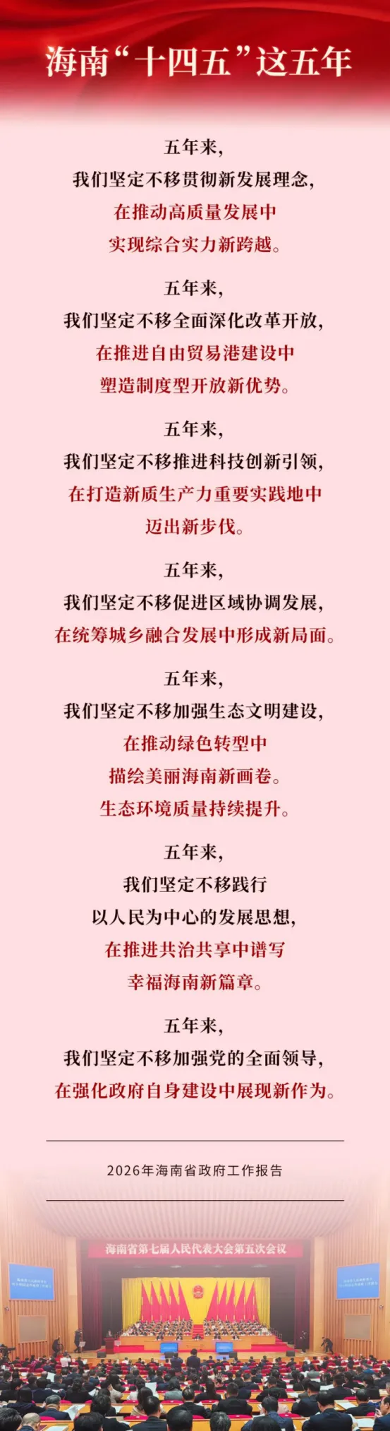 今年的政府工作报告全面总结了过去一年和“十四五”期间海南全面深化改革开放,扎实推进高质量发展所取得的非凡成就。擘画了海南“十五五”发展蓝图,提出了2026海南自由贸易港全面实施封关运作开局之年的发展目标和工作举措。下面我们通过报告中跃动鲜活的数字,感受海南澎湃的发展动能,共同奔赴自贸港更加生机勃发的下一个五年。