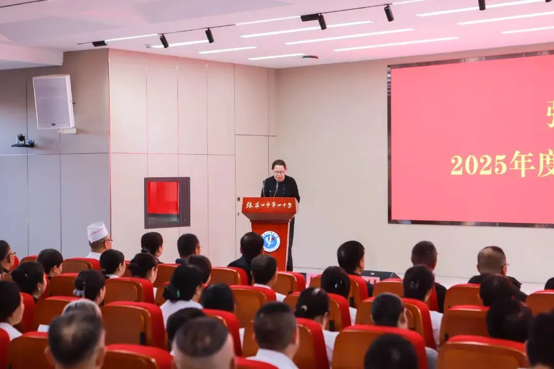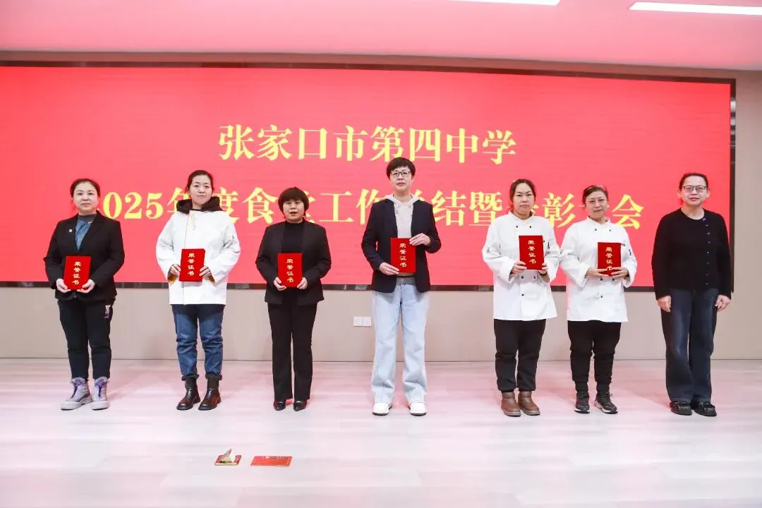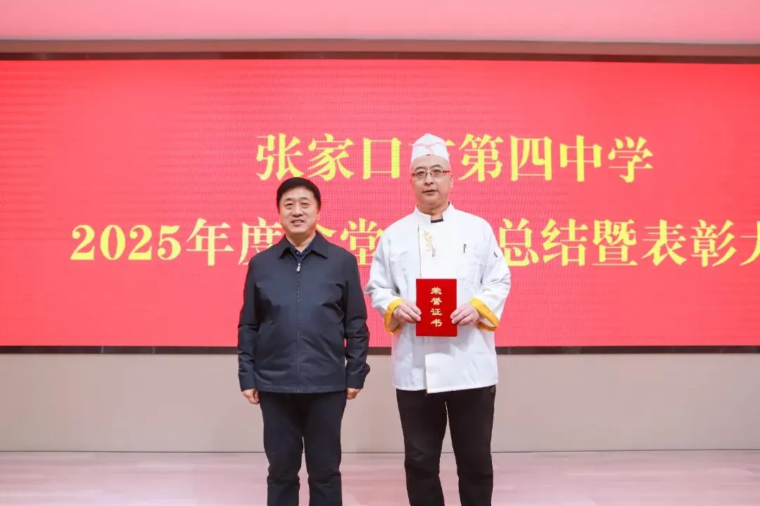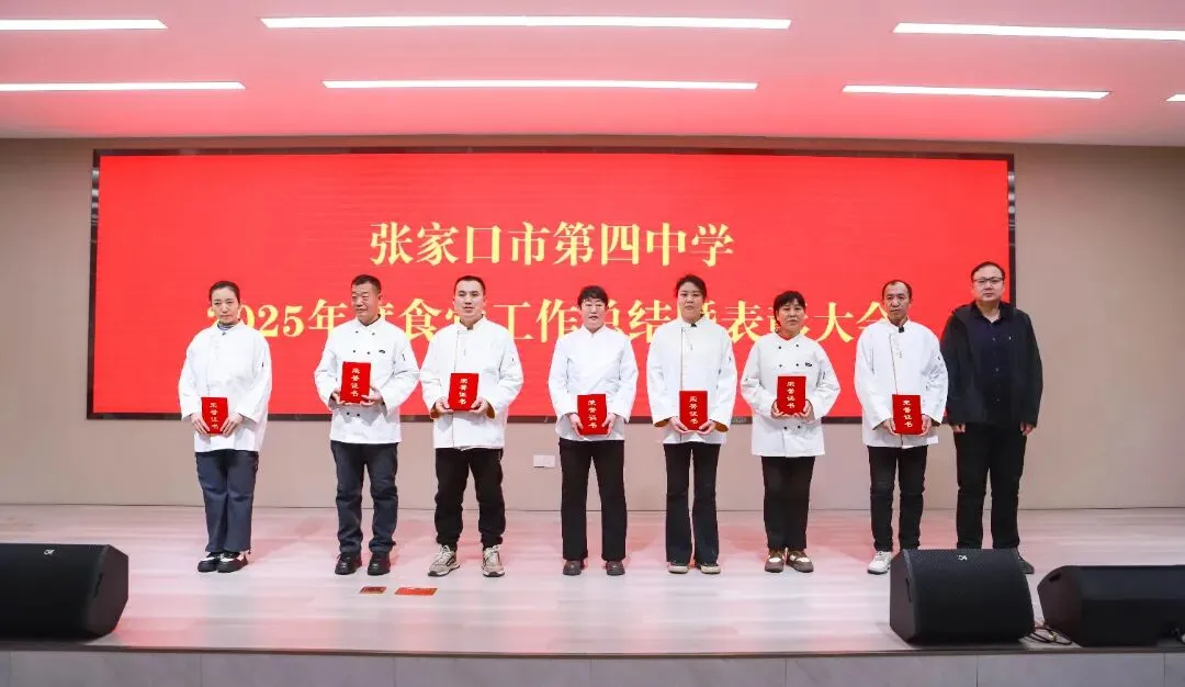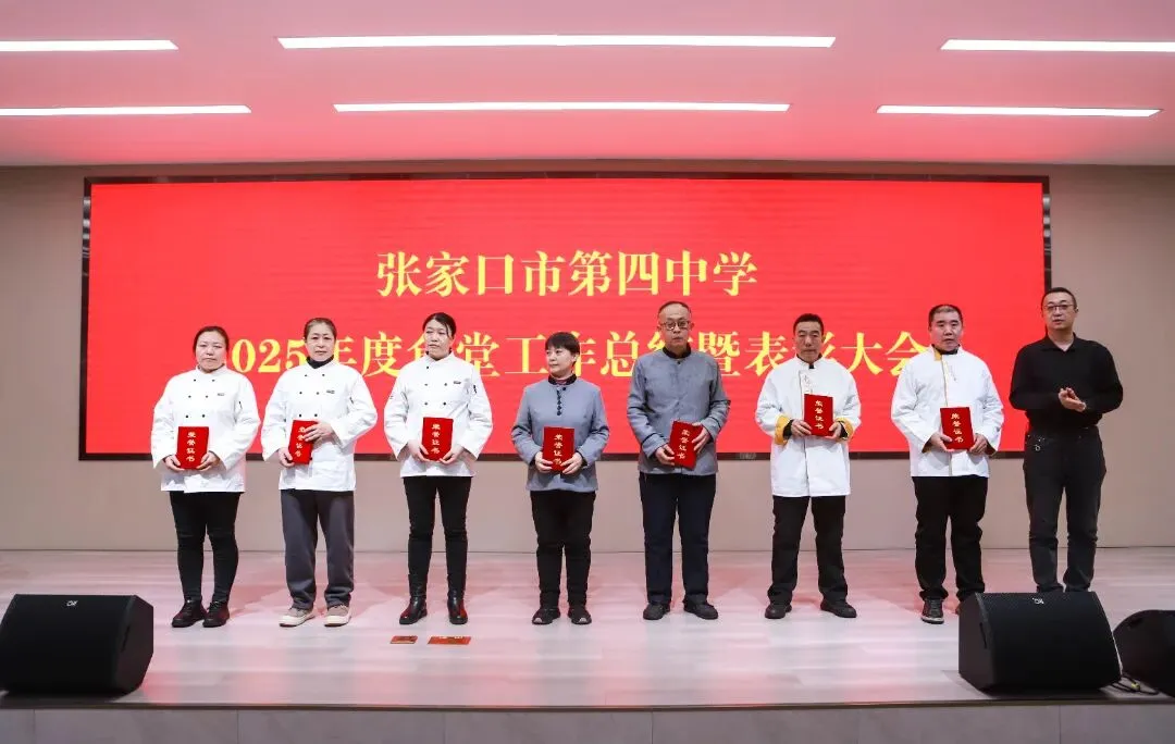 为总结过往、表彰先进、展望未来,2026年1月27日,张家口市第四中学2025年度食堂工作总结暨表彰大会在图书楼五楼报告厅召开。学校党委书记张彦明,党委副书记、校长马志勇,副校长李鑫磊、张敏等校领导出席会议,食堂全体员工参会。大会由食堂主管刘超主持。