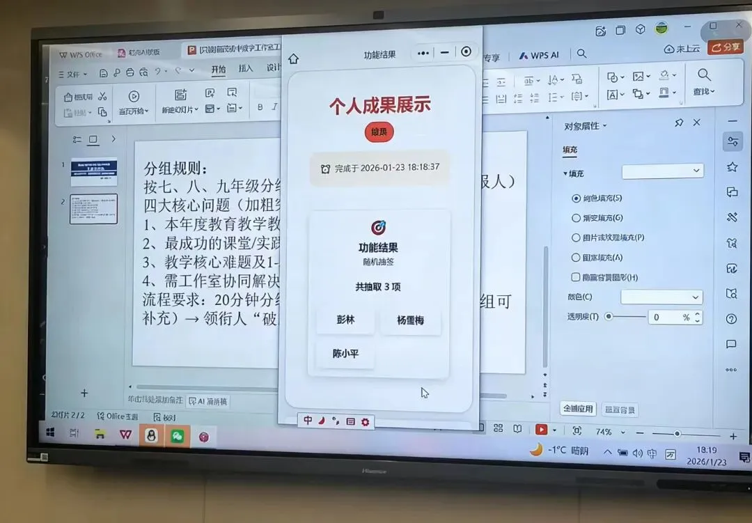在成果展示环节,现场随机抽取 3名成员分享年度核心成果,涵盖优质课件、分层作业设计、课题研究心得等,聚焦 “可复制、可推广” 的实践经验,为全体成员提供了宝贵的学习借鉴范例。会后,工作室将收集所有成员的年度成果,整理形成年度资源包归档共享。