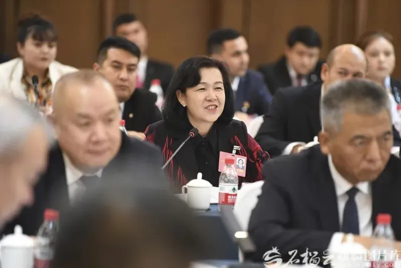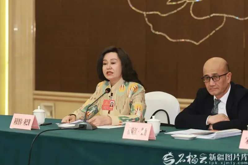1月27日,阿依努尔·阿巴斯代表(左)在参加乌鲁木齐市代表团审议时发言。石榴云/新疆日报记者 崔志坚摄