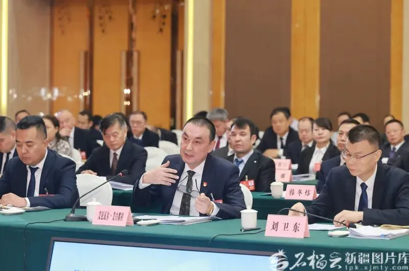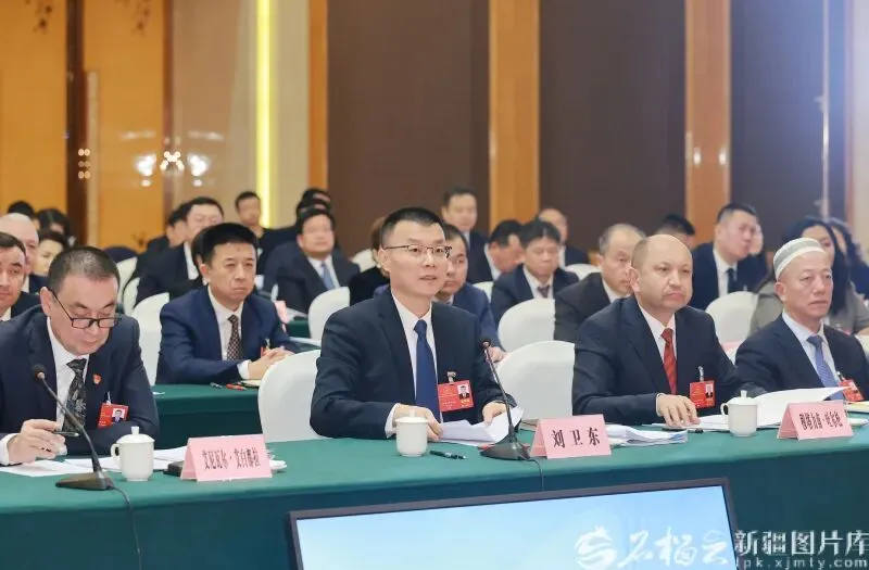 1月27日,刘卫东代表(前排左二)在参加乌鲁木齐市代表团审议时,围绕以民生需求为导向提升城市工作能力等内容发言。石榴云/新疆日报记者 崔志坚摄