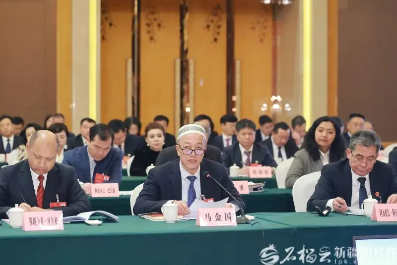 1月27日,马金国代表(中)在参加乌鲁木齐市代表团审议时,围绕铸牢中华民族共同体意识等内容发言。石榴云/新疆日报记者 崔志坚摄