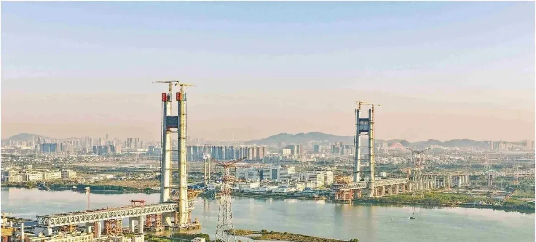 1月11日,深江铁路洪奇沥水道公铁大桥50号墩主塔顺利封顶。南方日报记者 石磊 摄