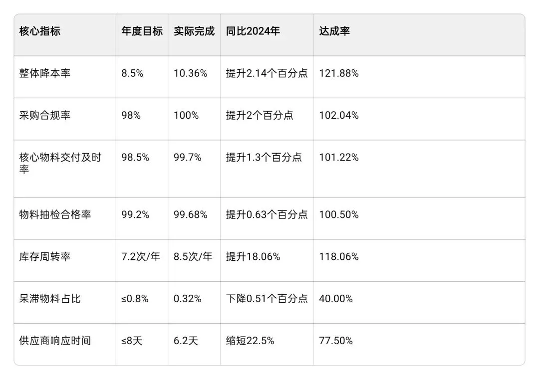 - 深度协同合作:推动60%以上核心供应商参与研发前端,联合开展5个以上成本优化项目;与战略供应商共建联合库存管理(VMI)模式,实现核心物料库存周转率提升至9.5次/年;