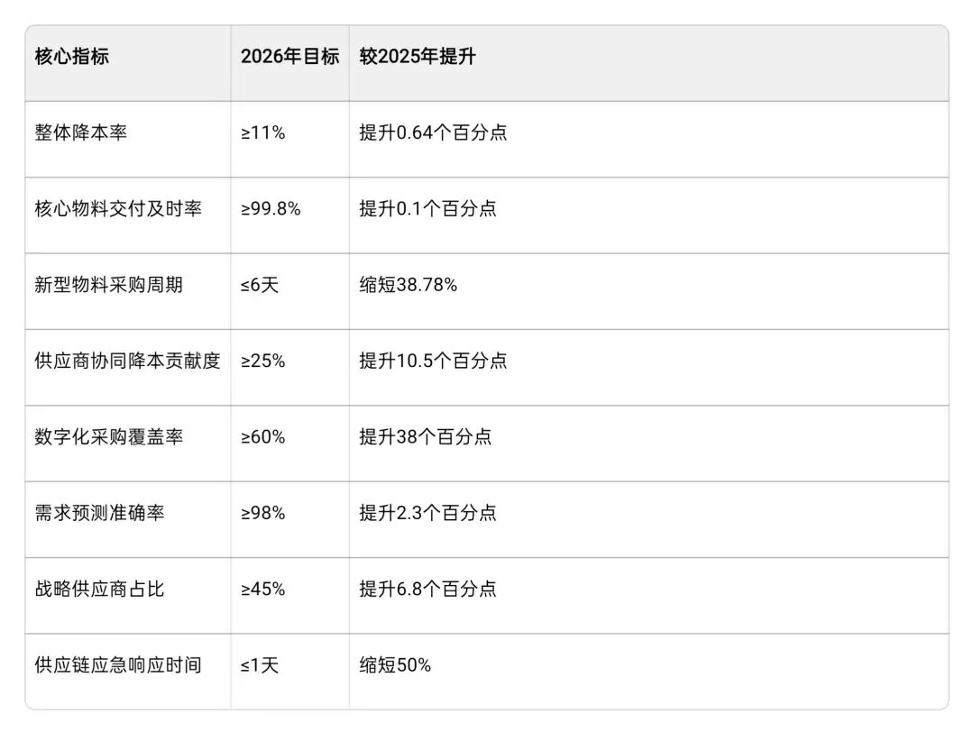 结合公司战略与行业趋势,2026年采购供应链部门将聚焦“智能升级、深度协同、极致降本”三大核心,设定以下目标: