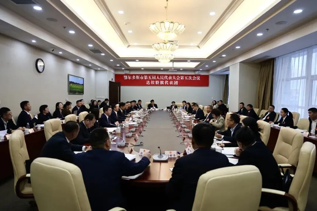 1月27日下午,参加鄂尔多斯市第五届人民代表大会第五次会议的达拉特旗代表团审议市政府工作报告。市下派代表陈曦、敖明、苗旺军,旗领导王小平、张伟雄、刘永福等参加审议。