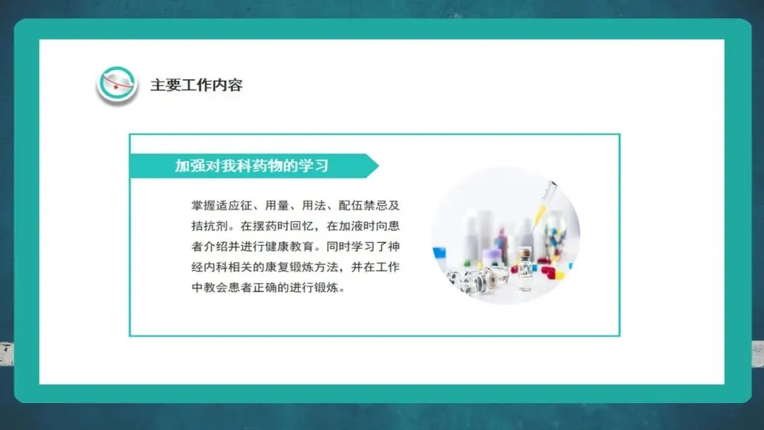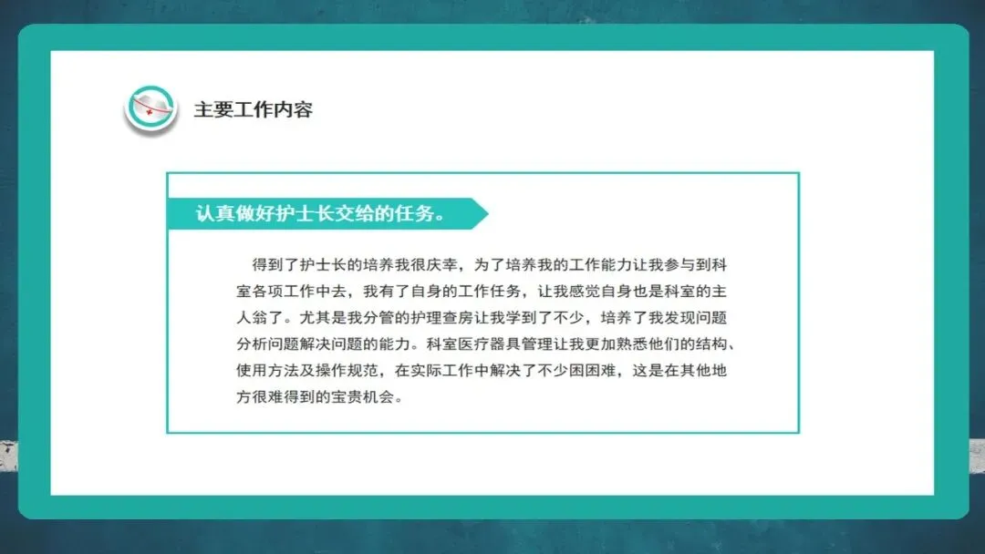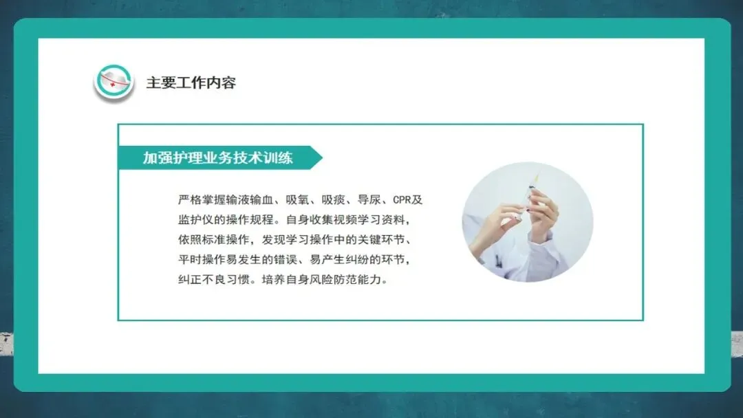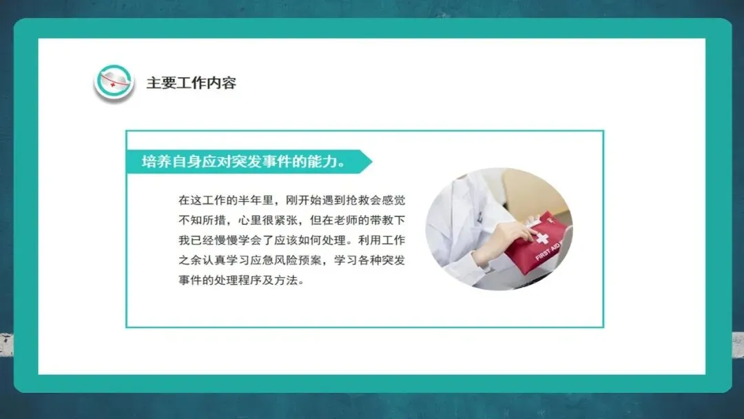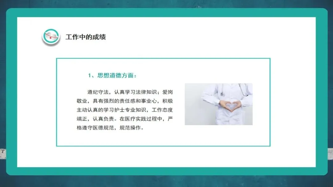 过去一年,我专注于提升护理操作的专业性与安全性,从输液、吸氧到急救操作,不断规范流程、防范风险。还记得第一次参与抢救时的紧张无措,但在老师的带教和应急预案的学习中,我逐渐学会了沉着应对。同时,我也积极参与科室管理工作,承担护理查房、医疗器具管理等任务,这些经历让我真正成长为科室的“主人翁”。