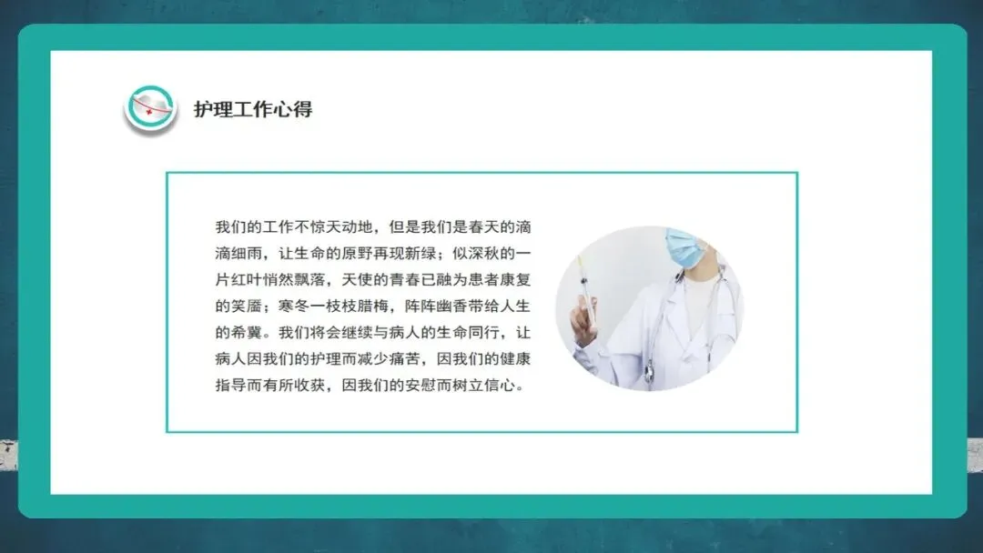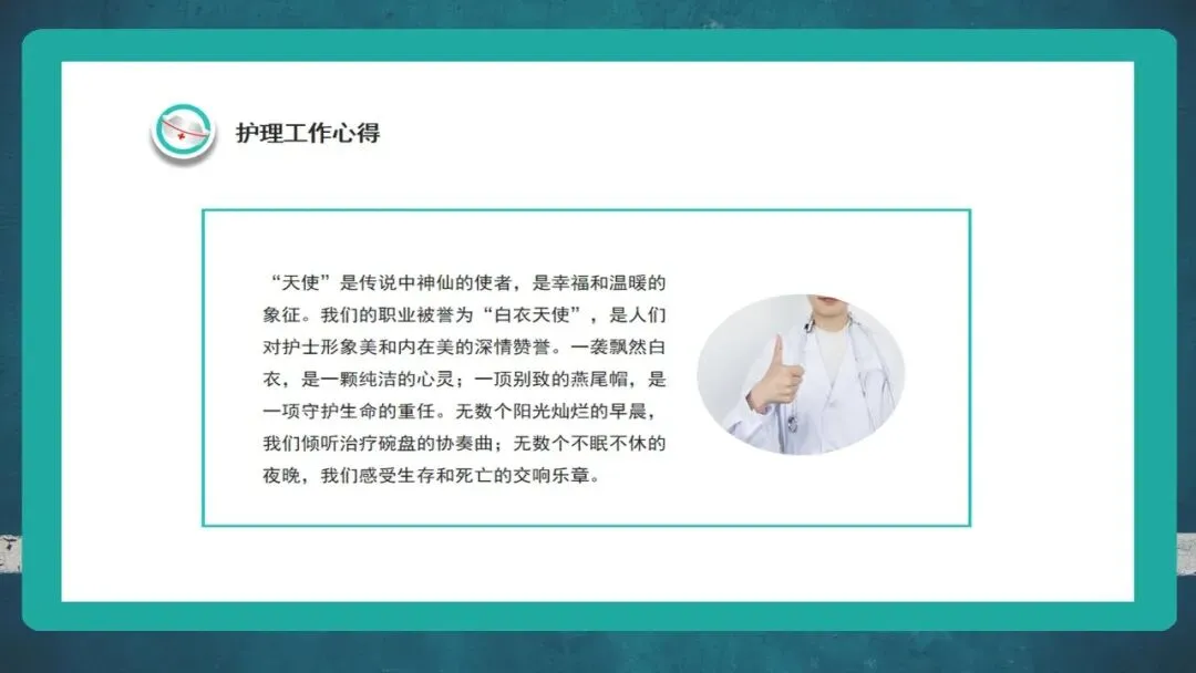 时光飞逝,转眼间,我在医院工作已近两年。在院领导、科主任和护士长的引领下,我始终秉持“以病人为中心”的信念,以严谨的态度投入护理工作。这段经历中,有泪水也有成长,有挑战更有收获。