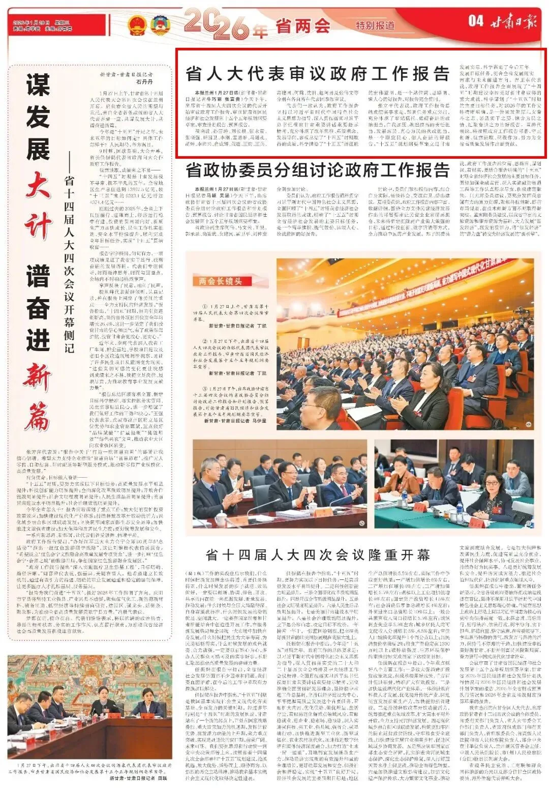 张立平代表说,政府工作报告总结成绩实事求是,部署任务重点突出,充分体现了牢记嘱托、砥砺奋进的政治担当,自我加压、挑起摸高的责任担当,发展惠民、真心为民的执政担当,是一个顺应民心、催人奋进的好报告。“十五五”规划纲要草案立足甘肃发展实际,科学谋划了今后五年发展目标任务,契合全省发展现实需求与未来前进方向。温卫东代表说,政府工作报告全面展现了“十四五”时期建设幸福美好新甘肃取得的重大成就,科学谋划了“十五五”时期的主要目标任务,对2026年的工作安排清晰明确,是一份激发陇原儿女奋斗之志、彰显实干之要、饱含为民之情、汇聚奋进之力的好报告。董涛代表说,将按照政府工作报告部署,守正创新、锐意进取、积极作为,努力为全省高质量发展作出新贡献。