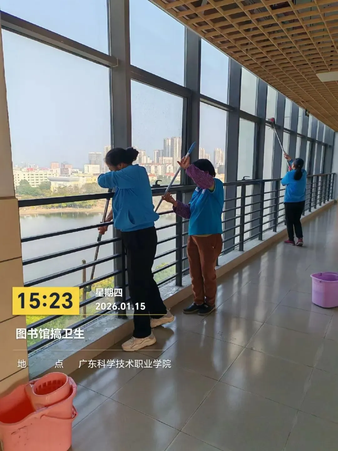 11、完成教学楼、实训楼及图书馆、双创等楼层走廊楼梯、厕所、窗户进行全面保洁;