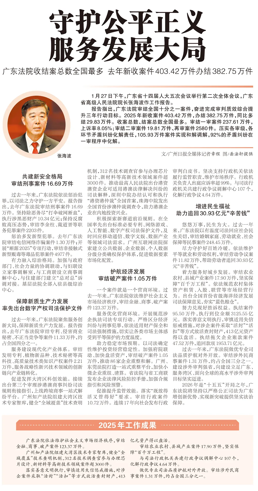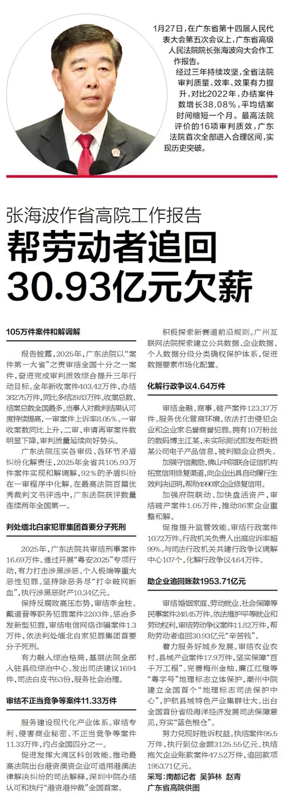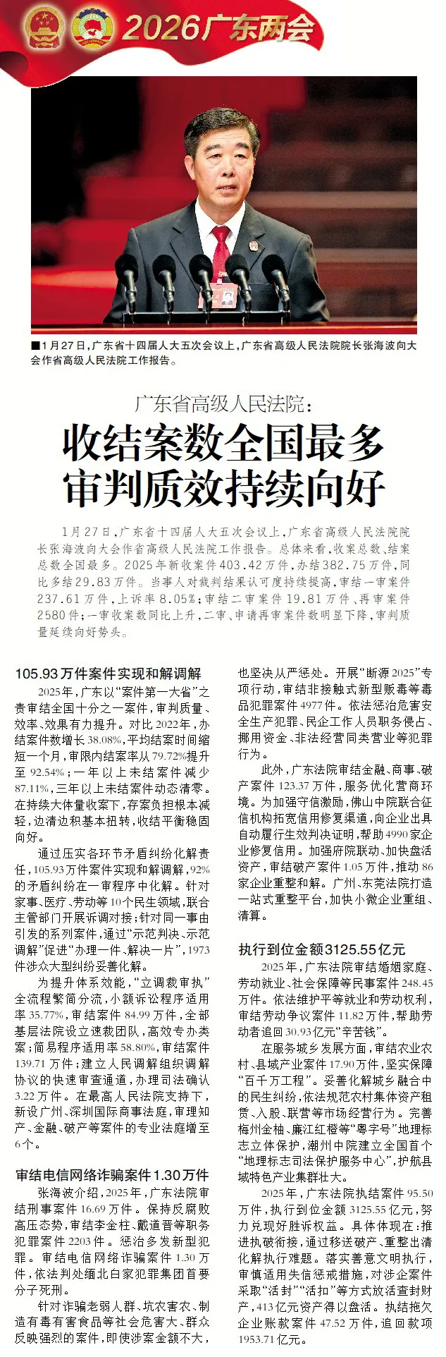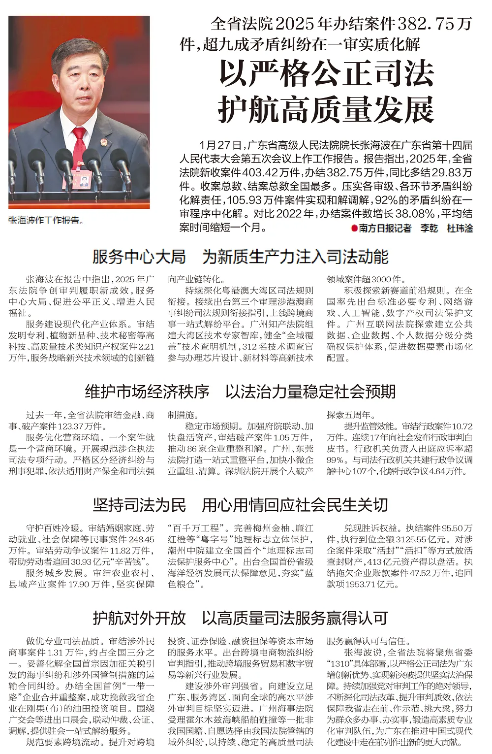 张海波在报告中指出,2025年广东法院争创审判履职新成效,服务中心大局、促进公平正义、增进人民福祉。