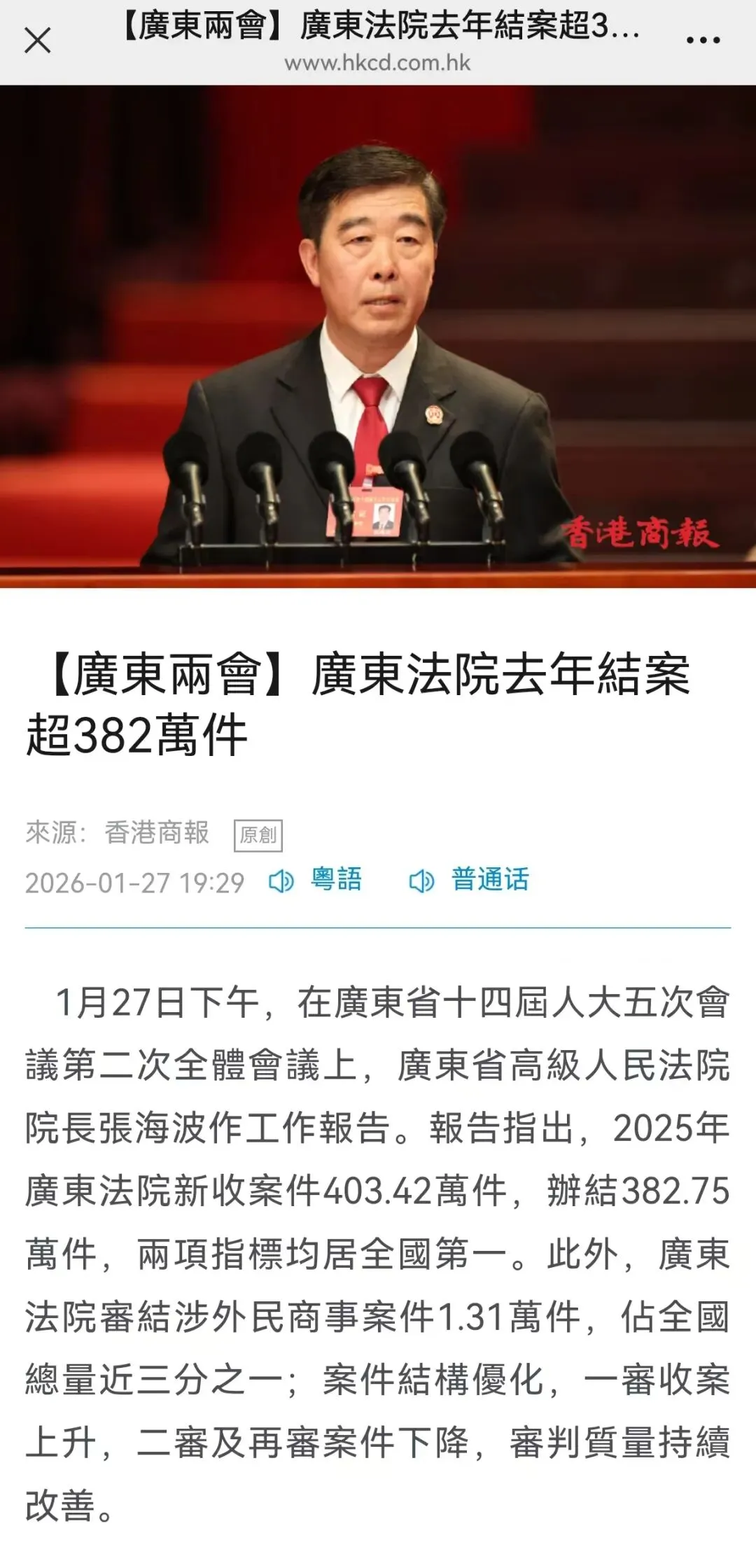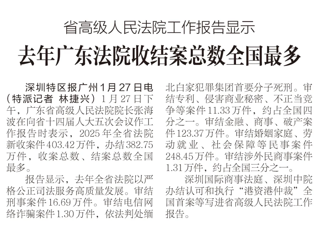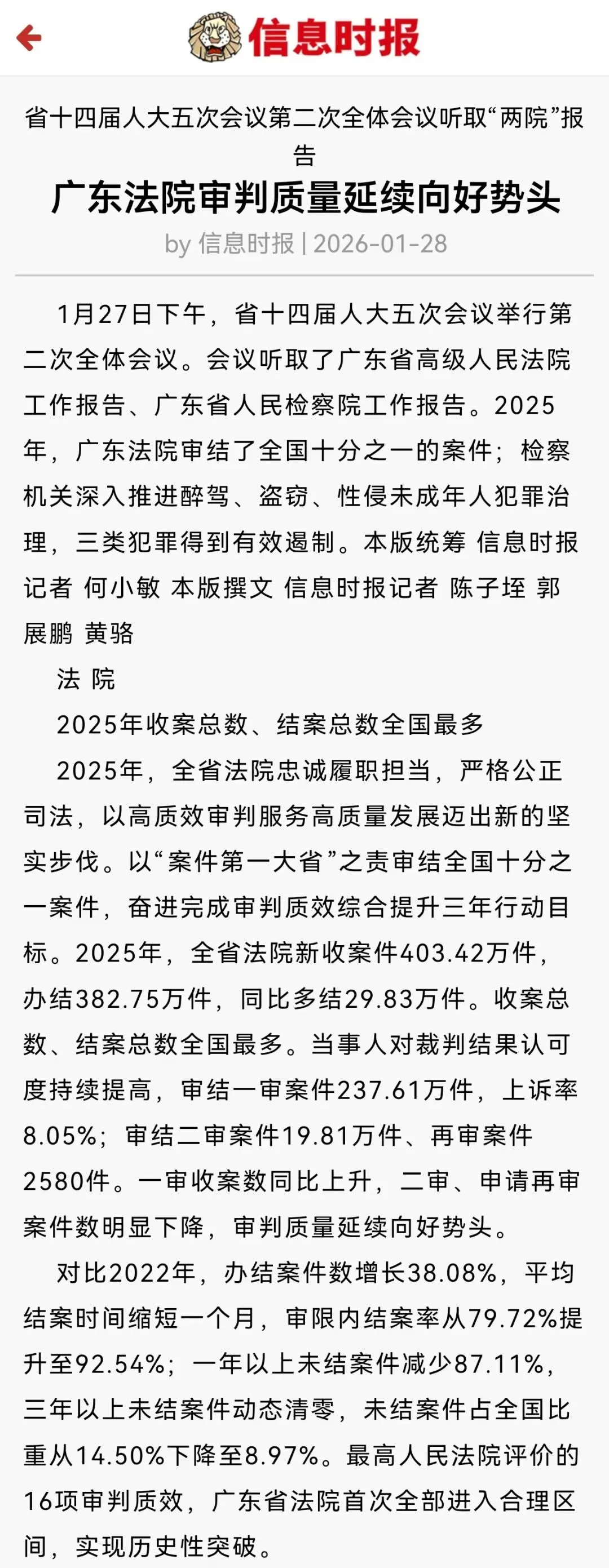 1月27日,广东省高级人民法院院长张海波在广东省第十四届人民代表大会第五次会议上作工作报告。报告指出,2025年,全省法院新收案件403.42万件,办结382.75万件,同比多结29.83万件。收案总数、结案总数全国最多。压实各审级、各环节矛盾纠纷化解责任,105.93万件案件实现和解调解,92%的矛盾纠纷在一审程序中化解。对比2022年,办结案件数增长38.08%,平均结案时间缩短一个月。