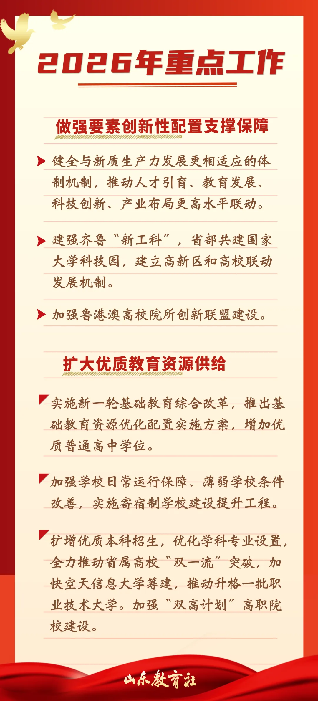1月27日上午,山东省第十四届人民代表大会第四次会议开幕,省长周乃翔作政府工作报告。报告中回顾了2025年及“十四五”时期以来山东教育事业发展的主要成效,明确了2026年教育领域的重点工作方向。小编梳理了其中教育相关内容,带您一同关注。