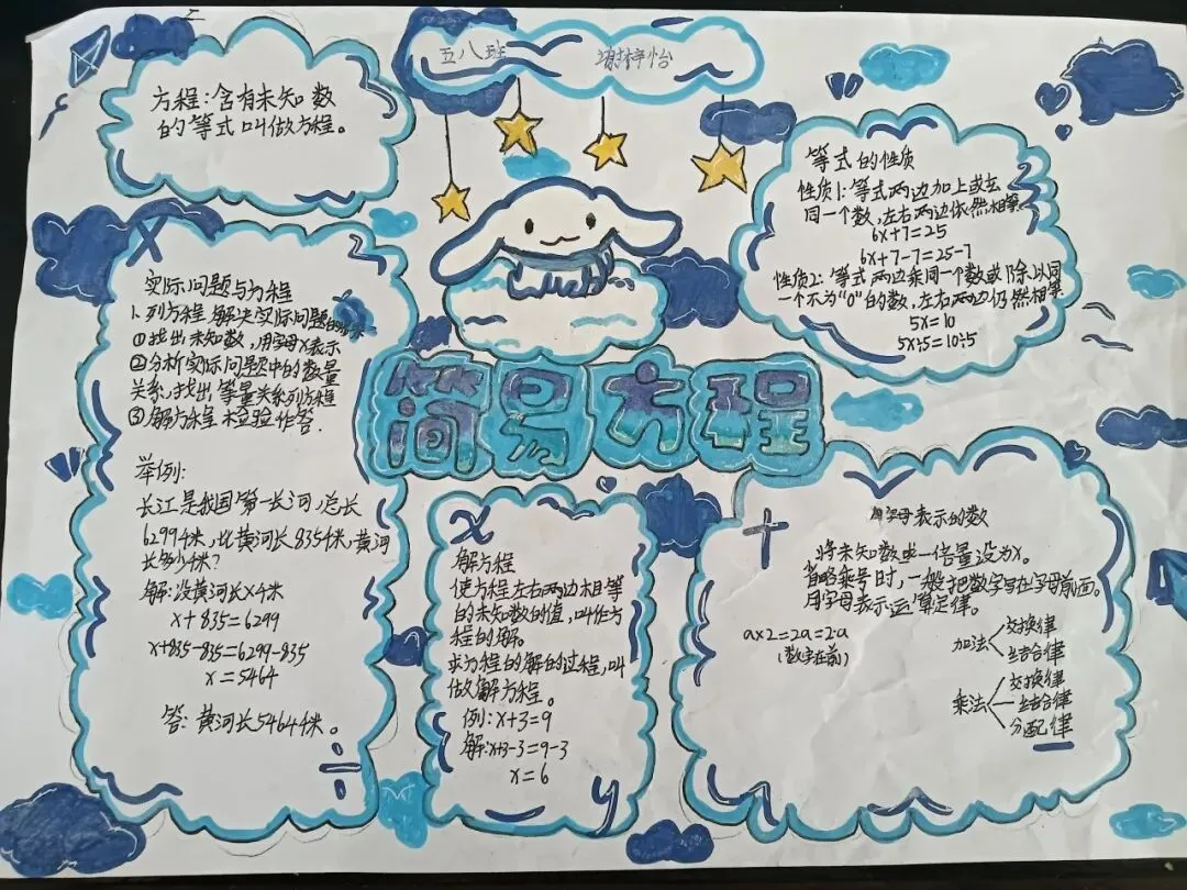 2、 数学手抄报展示:围绕 《小数除法》 、《简易方程》、《多边形的面积》 等单元,我们举办了数学手抄报展。学生通过梳理单元脉络、图解概念、总结易错点等方式,将知识系统化、可视化,锻炼了归纳与审美能力。
