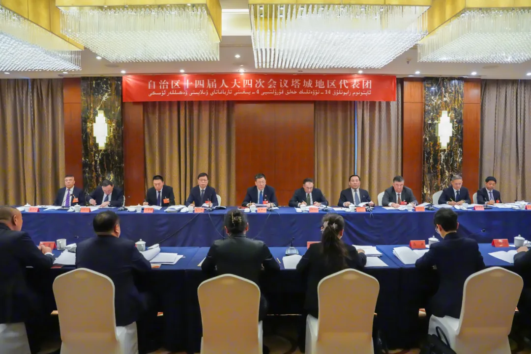 自治区人大常委会党组副书记、副主任王明山,自治区人大常委会党组成员、副主任托乎提·亚克夫参加审议并发言。塔城地区代表团团长、塔城地委书记支现伟主持会议并发言。