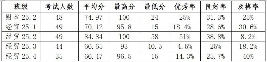 从我所负责的五个班级的成绩分布来看,经贸25.2班成绩较为突出,紧随其后的是财政25.2班,经贸25.1班,接着是经贸25.4班,经贸25.3班。这些班级中学生分数的跨度较大,最低分仅为15分,显示出个别学生在基础知识掌握上存在显著漏洞或考试策略不当,可能存在学习态度不够端正的问题,比如缺乏足够的复习时间、对待学习不够认真或缺乏有效的学习方法;而最高分达到了100分,表明有学生不仅扎实掌握了课本知识,还具备出色的解题技巧和应试能力。因此,在今后的教学中会注重不同班级的表现差异,采取更加个性化的教学措施。