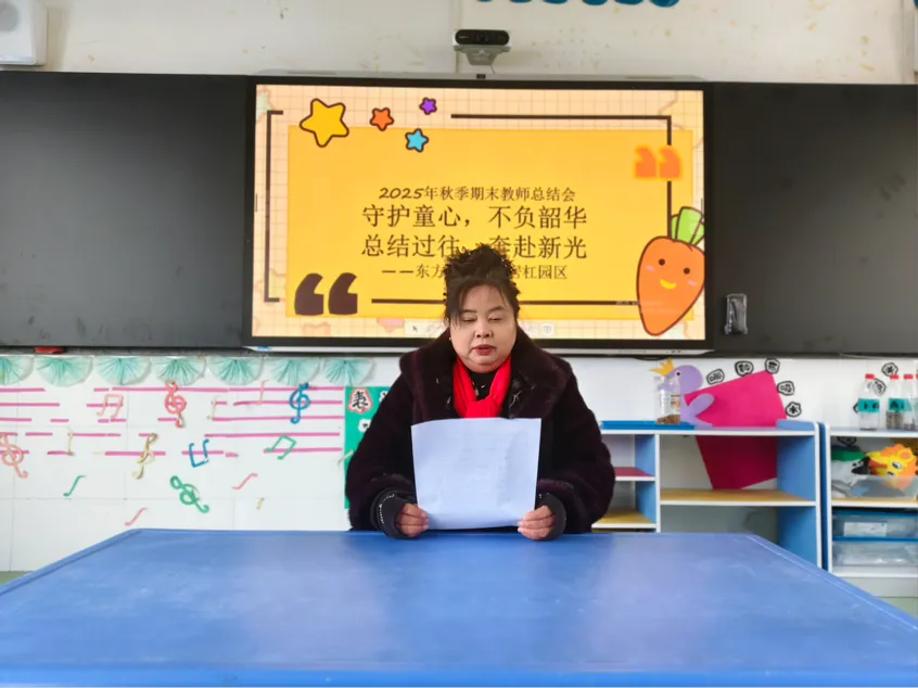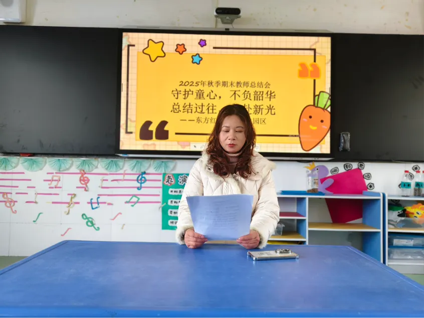 在教师们总结交流后,刘园长结合全园年度工作情况,发表讲话。刘园长首先对全体教职工一年来的辛勤付出与显著成效给予了高度肯定:正是每一位老师的坚守与深耕,才有了孩子们的健康成长,才有了幼儿园的稳步发展。大家用爱心浇灌童心,用专业赋能成长,值得每一份掌声与敬意。刘园长强调:教育是一场温暖的修行,既要回望来时路,更要看清前行方。希望全体教职工以“精耕细作”的态度,以“爱与责任”为底色,共同推动幼儿园教育质量再上新台阶。