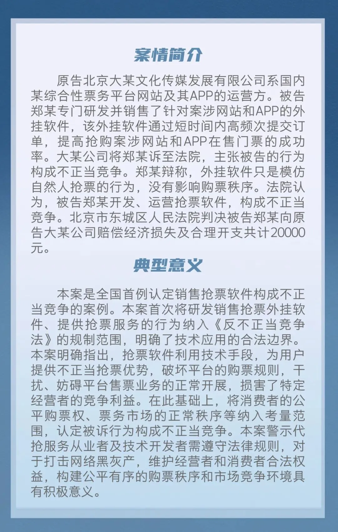 围绕提振消费、扩大内需,审结反垄断、反不正当竞争案件1429件,在全国首例销售抢票外挂软件不正当竞争、某行业协会横向垄断等案件中,依法规制排除限制竞争的行为,促进建设统一大市场。