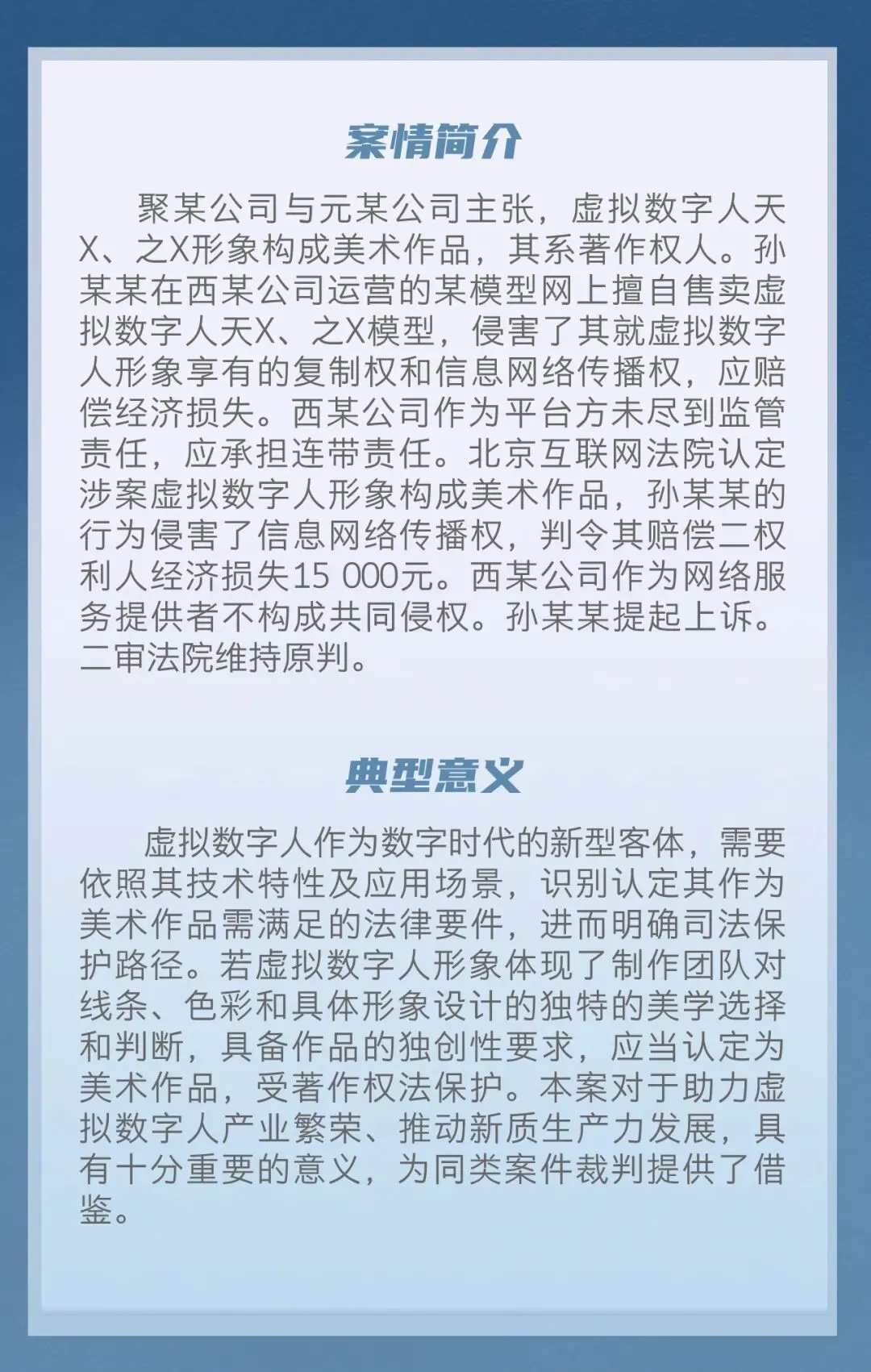 加强数据合法权益保护,审结涉数据产权、人工智能等案件9963件,坚持依法规范与促进发展相结合,在“AI生成声音带货”“虚拟数字人形象侵权”“变身漫画特效不正当竞争”“非法抓取网络平台数据集合”等有重要影响的新类型案件中,发挥裁判规则指引作用,助力新业态新模式健康发展。
