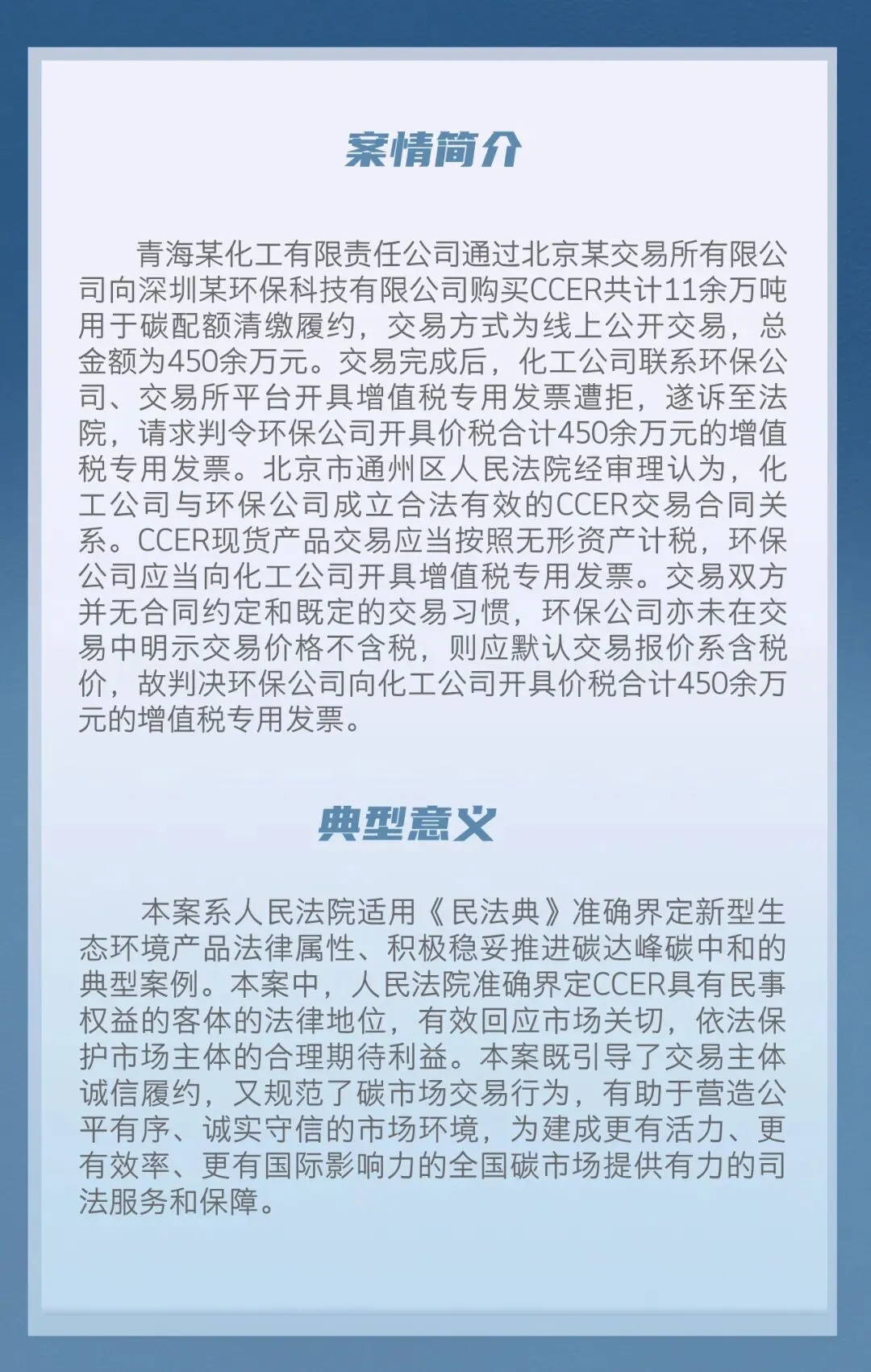 与北京绿色交易所合作建立涉碳交易一站式多元解纷中心,在全国首例国家核证自愿减排量交易涉税案中,为碳市场建设提供法律规则指引,促进绿色低碳发展。