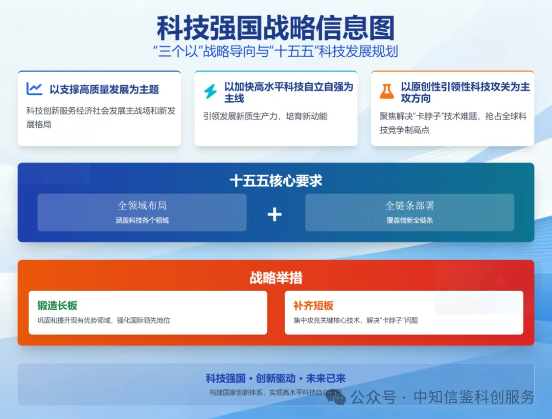 "十五五"期间要重点做好"全领域布局、全链条部署",持续锻造长板、补齐短板,确保科技强国各项任务落实落地。