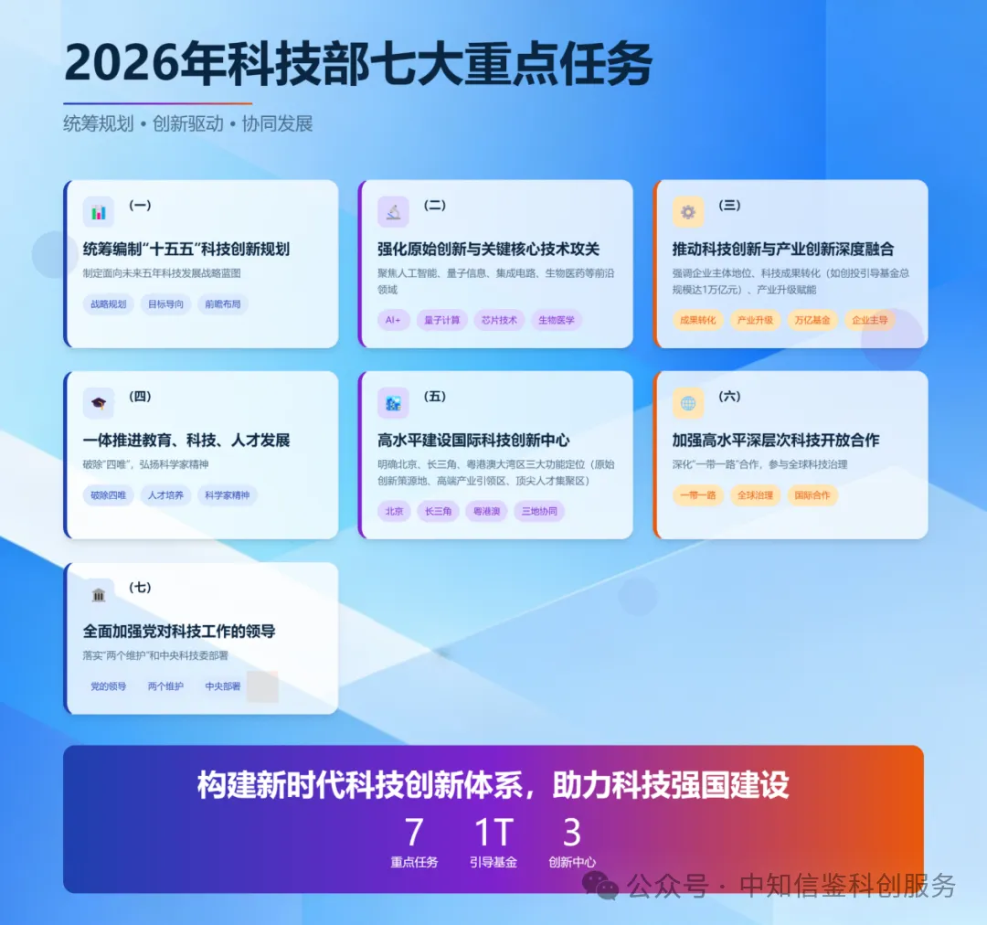 作为"十五五"开局之年,2026年科技部将重点推进七大任务,确保开好局、起好步: