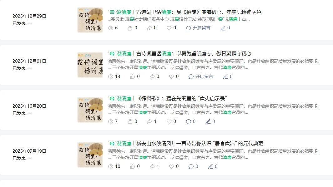 以“共话精神、共创文化、共享实践”三篇文章为抓手,通过多元化举措开展清廉文化倡议和宣传,筑牢清廉社会组织建设防线。开设【“窑”说清廉】专栏,宣发12篇清廉故事,阅读量超500人次;举办8场清廉建设活动,服务500余人次,打造融合本土元素的清廉文化阵地,设置清廉展示区、承诺墙;健全内部监督机制,完成20家社会组织规范化检查,推动廉洁理念融入社会组织发展全流程。