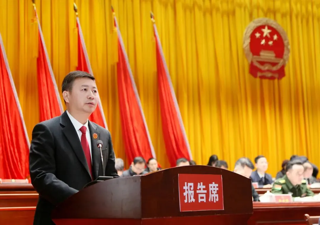 2026年1月28日,在蓝山县第十八届人民代表大会第六次会议上,蓝山县人民法院党组书记、院长陈祁陵向大会报告工作。