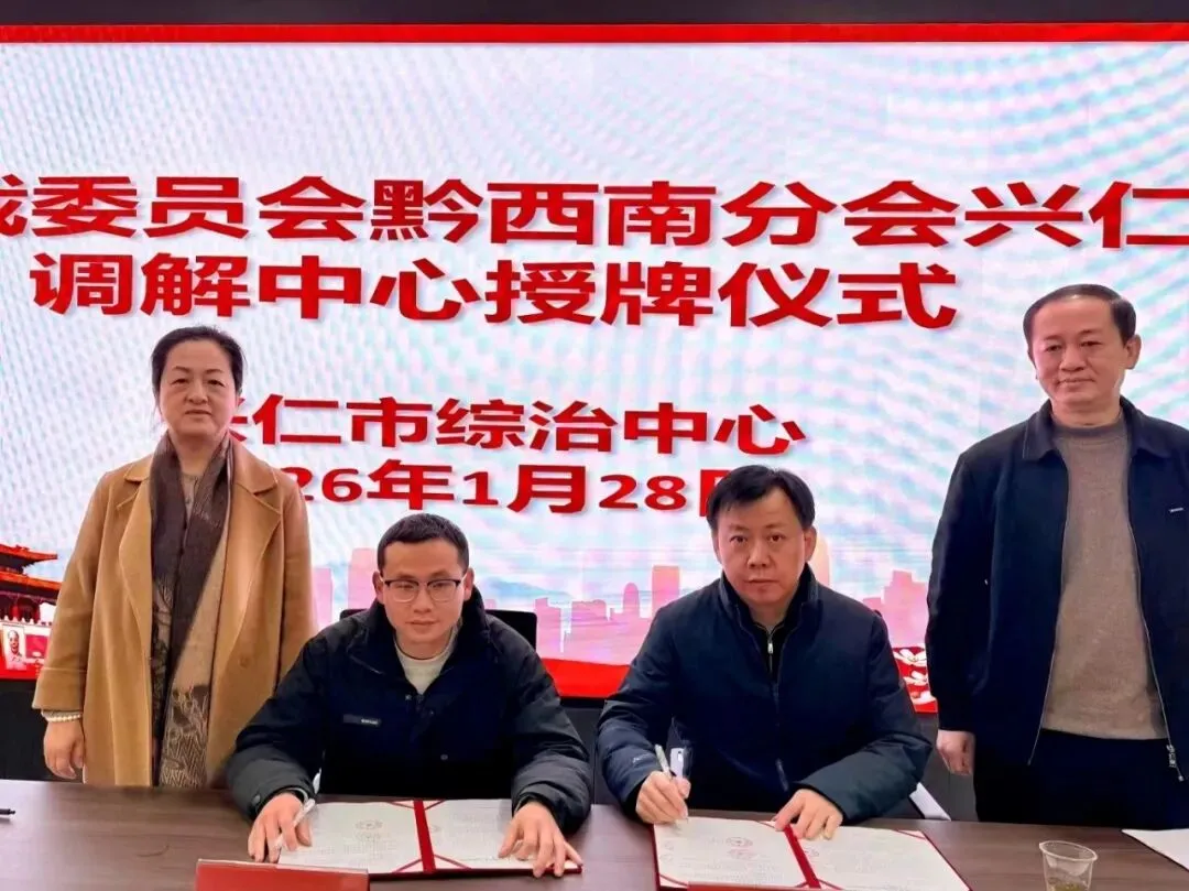 授牌仪式上,王常毅与兴仁市综治中心主任邓万伟签署工作备忘录,卜贵荣与兴仁市政法委书记白品华为调解中心授牌。
